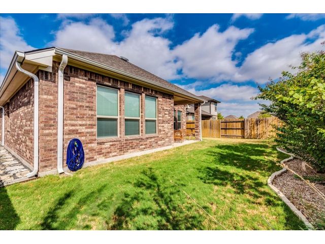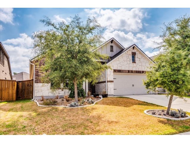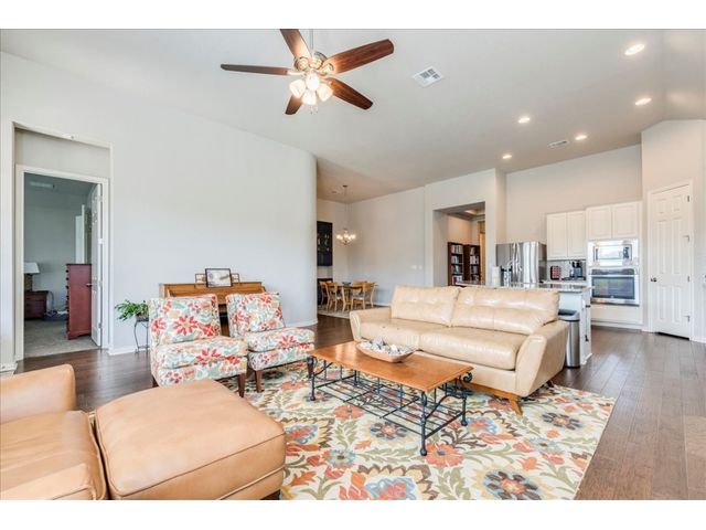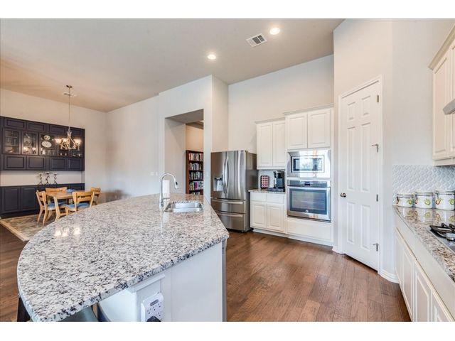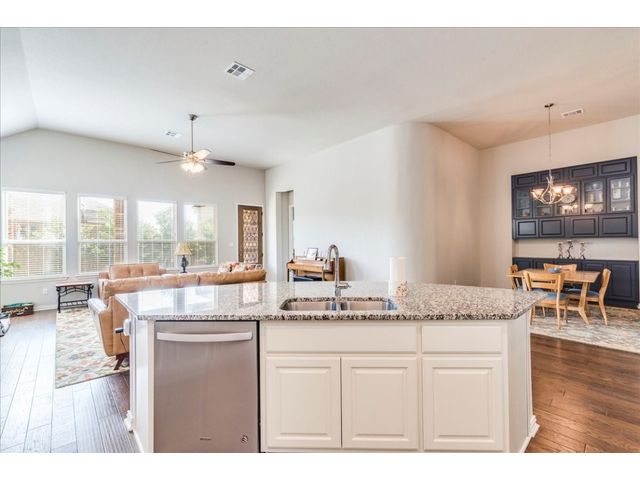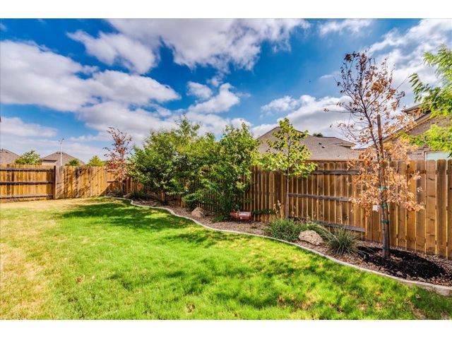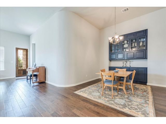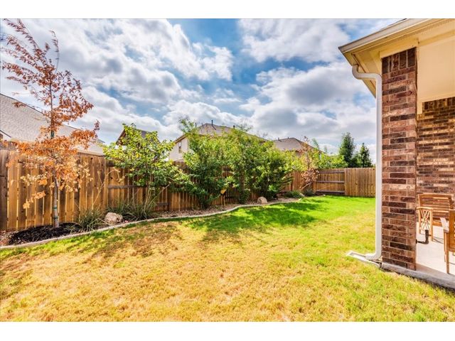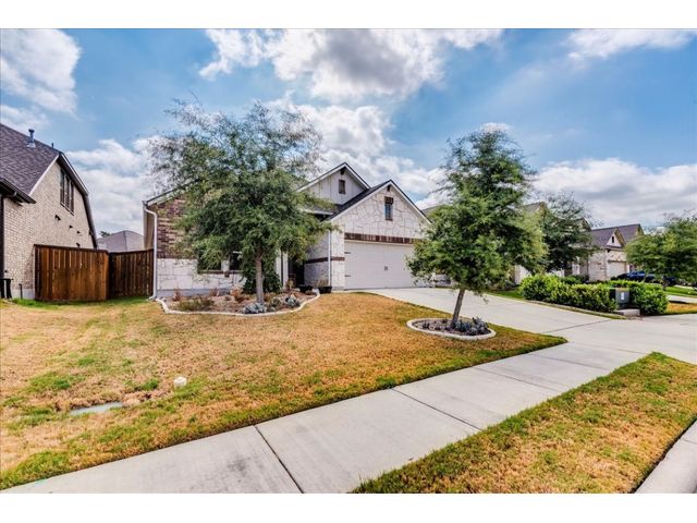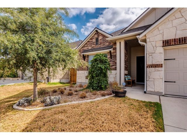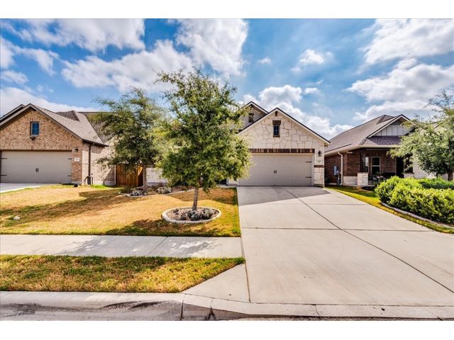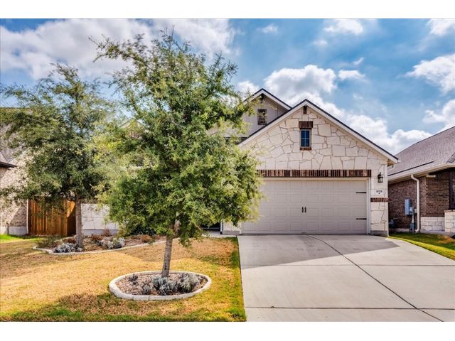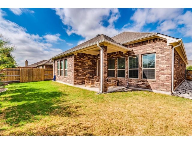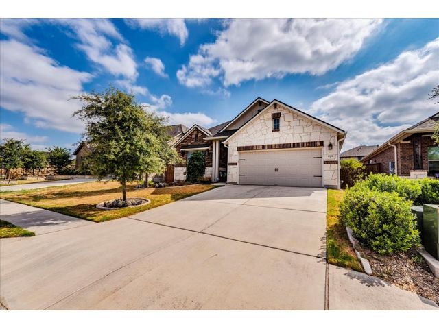 This beautiful 3bedroom/2 bath/3 car garage single story home is great for entertaining! Light and bright with Open concept floorplan is great for entertaining! An oversized center island, that seats 4, is the Heart of the Home. Kitchen features Stainless steel appliances, granite countertops, and beautiful backsplash, and white cabinets. Beautiful dark blue Custom cabinets with built in buffet in the oversized dining room will store all your fine China. Hardwoods throughout main living spaces. Carpet only in bedrooms. Spacious owner's suite has plenty of room for a king size bed. The ensuite bath features dual vanities separated by a soaking tub and an additional stand alone shower. His and Hers owner suite walk in closets. Laundry room has additional built in storage. Custom back door opens to a quaint backyard and covered patio, great for morning coffee. 3 car tandem garage. Leander ISD. Palmera Ridge is minutes from shopping and restaurants and grocery. This home you don't want to miss!