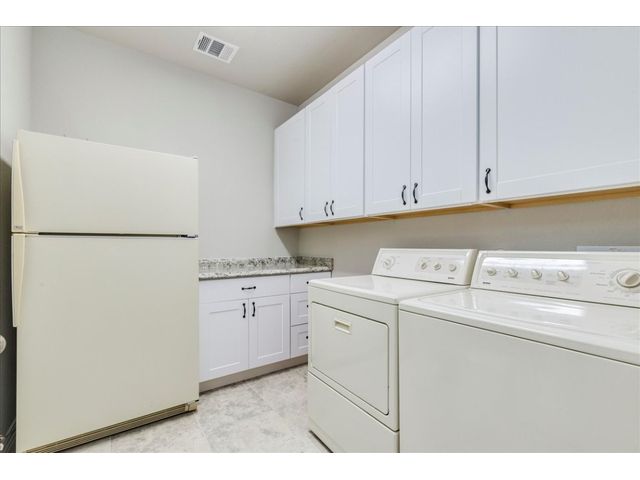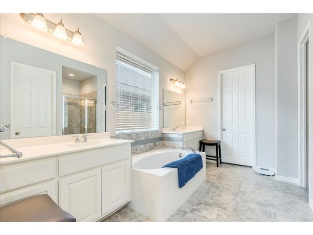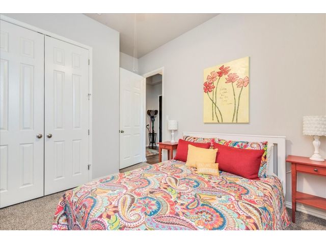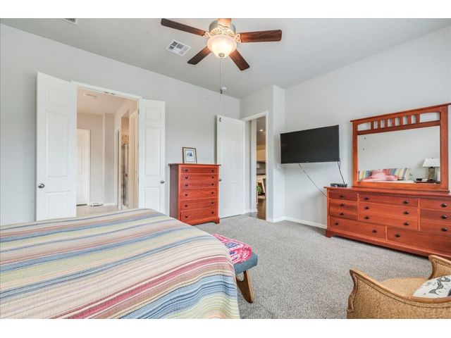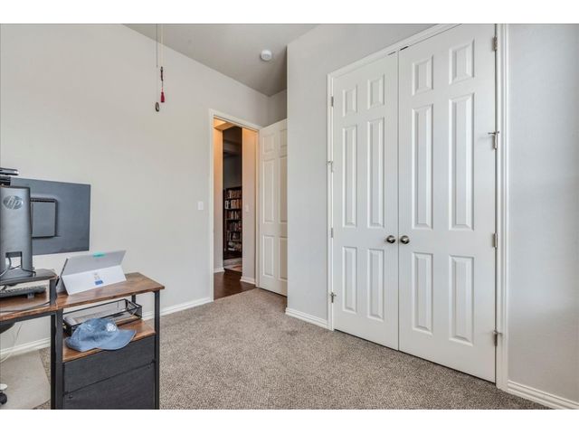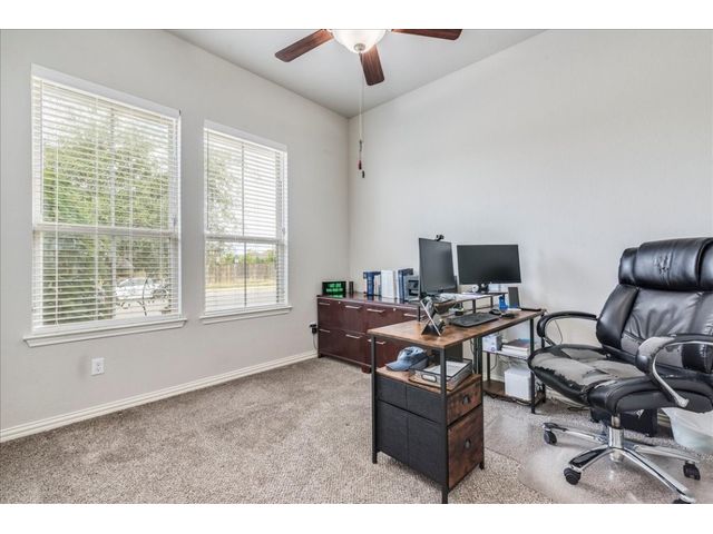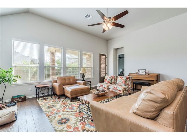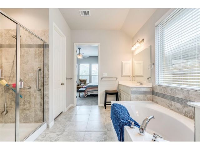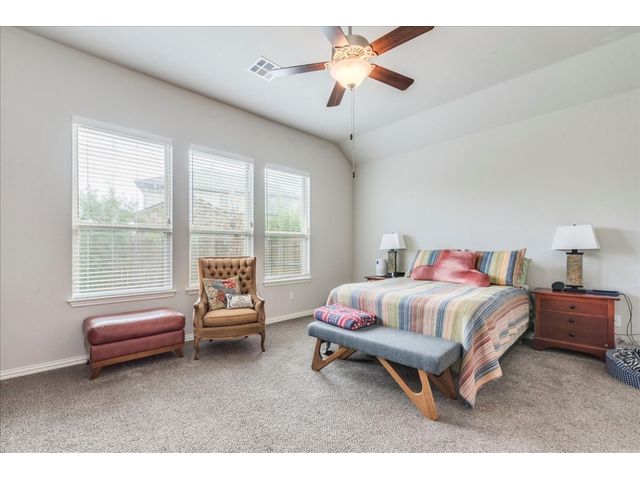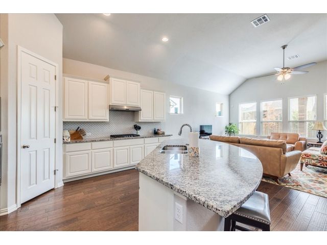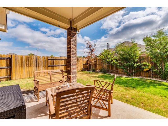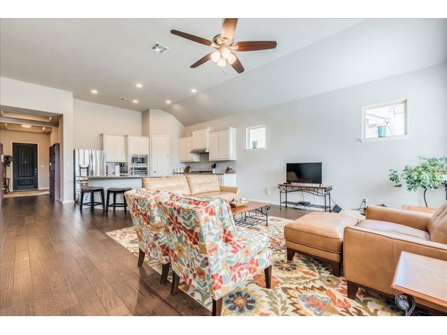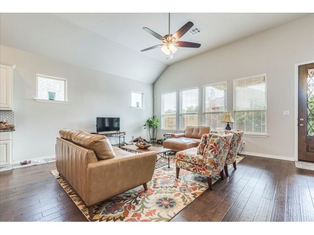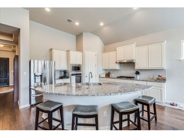 This beautiful 3bedroom/2 bath/3 car garage single story home is great for entertaining! Light and bright with Open concept floorplan is great for entertaining! An oversized center island, that seats 4, is the Heart of the Home. Kitchen features Stainless steel appliances, granite countertops, and beautiful backsplash, and white cabinets. Beautiful dark blue Custom cabinets with built in buffet in the oversized dining room will store all your fine China. Hardwoods throughout main living spaces. Carpet only in bedrooms. Spacious owner's suite has plenty of room for a king size bed. The ensuite bath features dual vanities separated by a soaking tub and an additional stand alone shower. His and Hers owner suite walk in closets. Laundry room has additional built in storage. Custom back door opens to a quaint backyard and covered patio, great for morning coffee. 3 car tandem garage. Leander ISD. Palmera Ridge is minutes from shopping and restaurants and grocery. This home you don't want to miss!