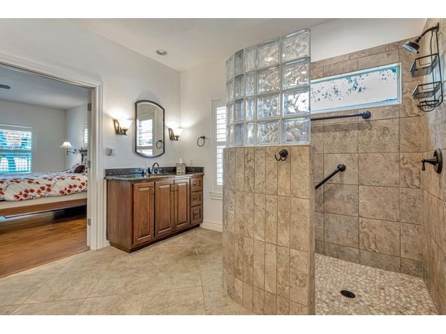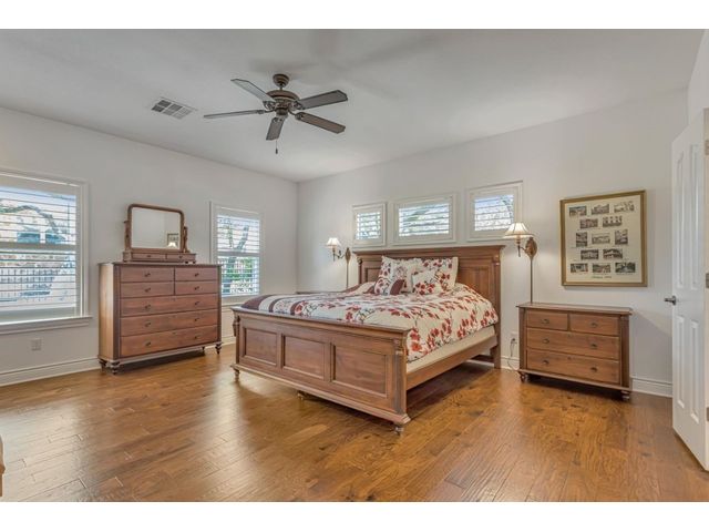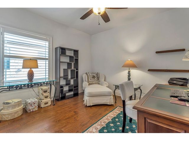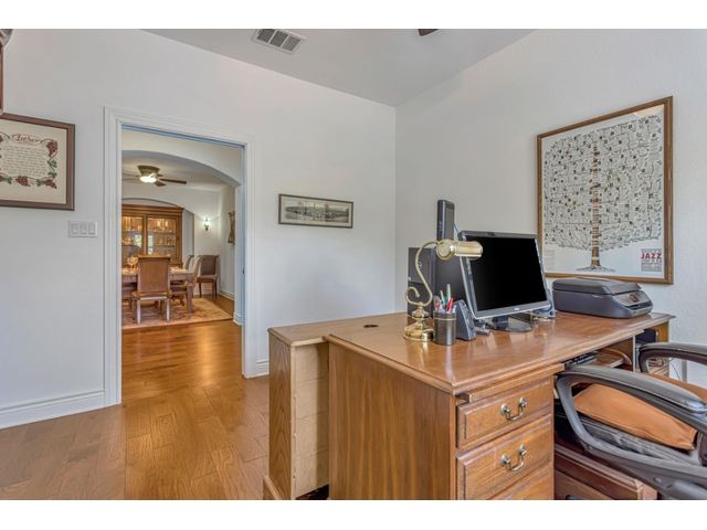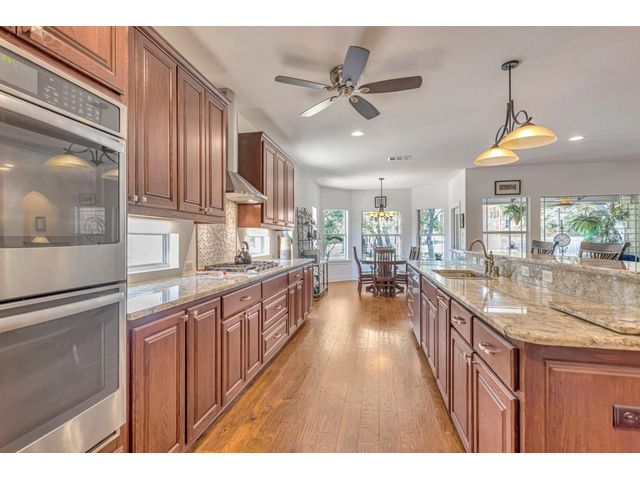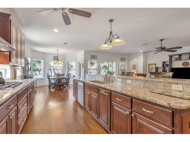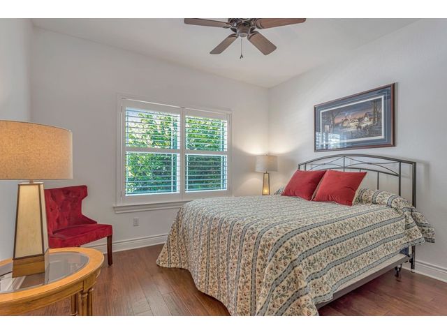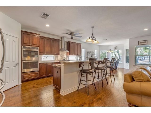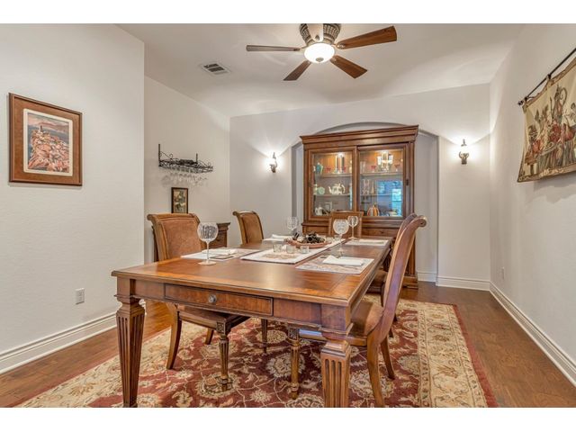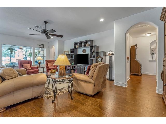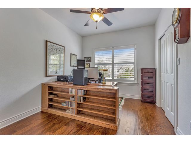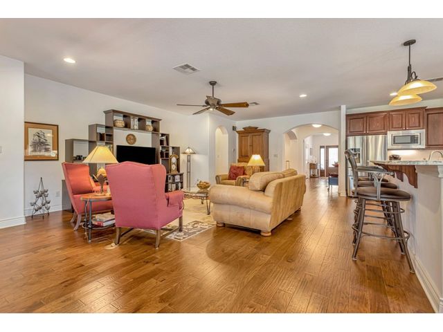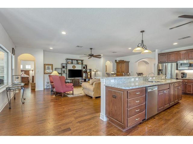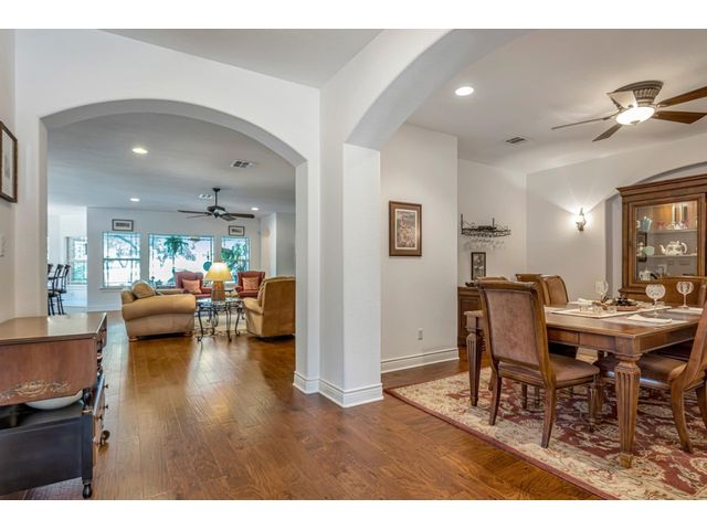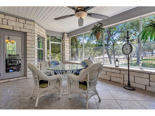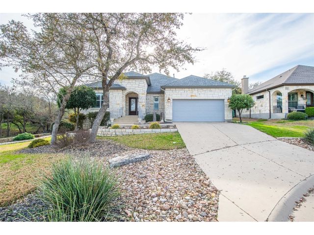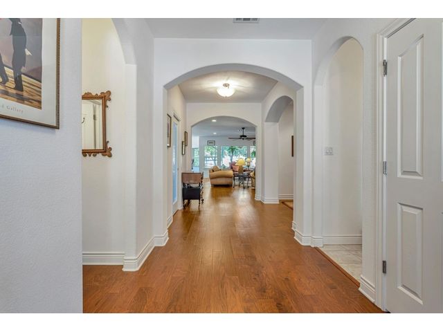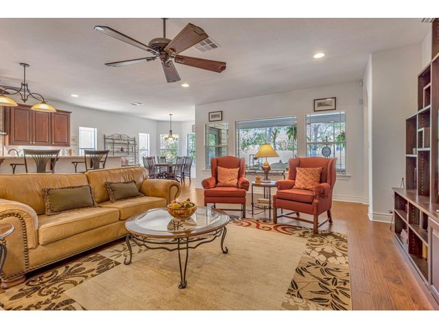 Exclusive 55+ Community in Georgetown, TX! This home features approximately 2,690 square feet of living space with three bedrooms and two and a half bathrooms. The residence was custom-built by Jimmy Jacobs and offers a thoughtful layout with a designated office space and a separate formal dining room. The primary bedroom includes his-and-her closets and vanities, providing ample storage and convenience. The gourmet kitchen boasts stainless steel appliances, ideal for those who enjoy cooking and entertaining. The enclosed back patio allows for peaceful outdoor enjoyment, offering a tranquil view of the greenbelt and provides the opportunity to observe local wildlife. This home presents a comfortable and versatile living environment, suitable for a variety of prospective buyers.
