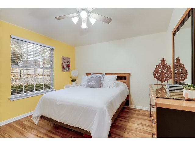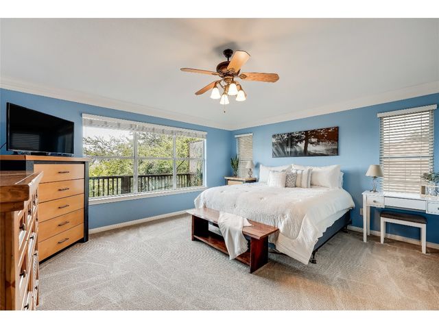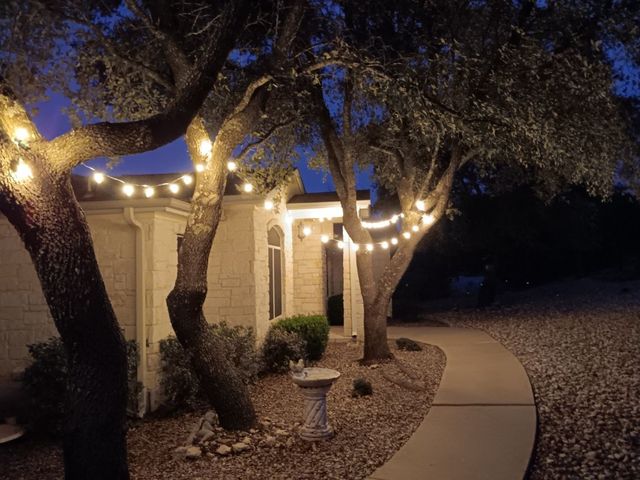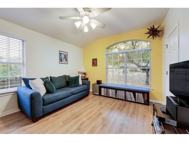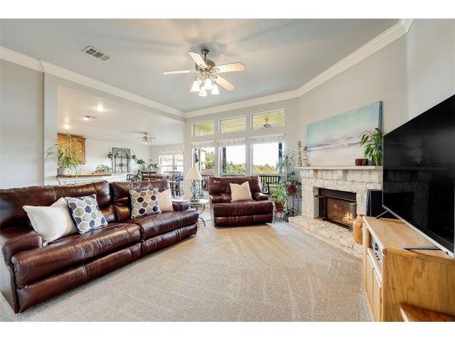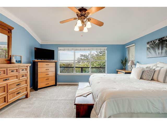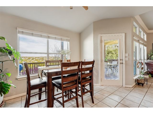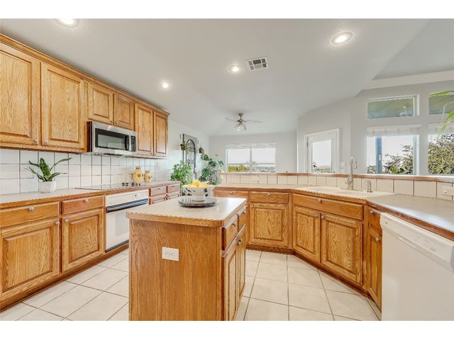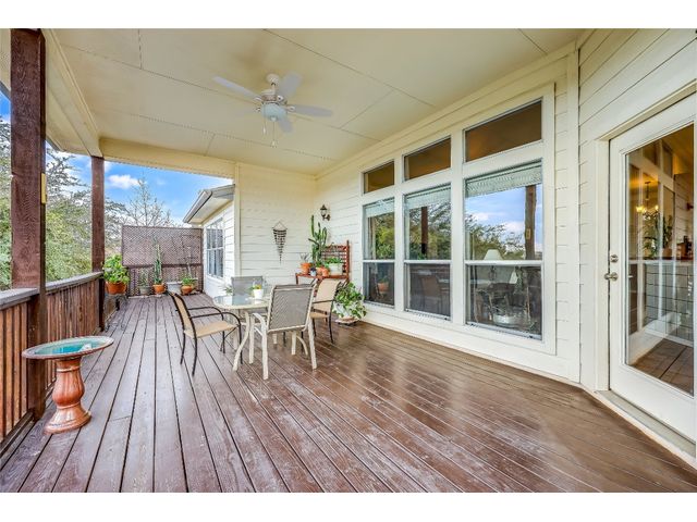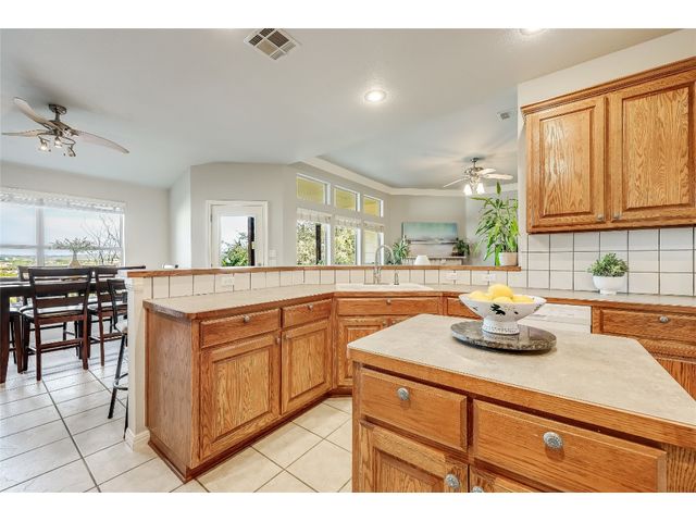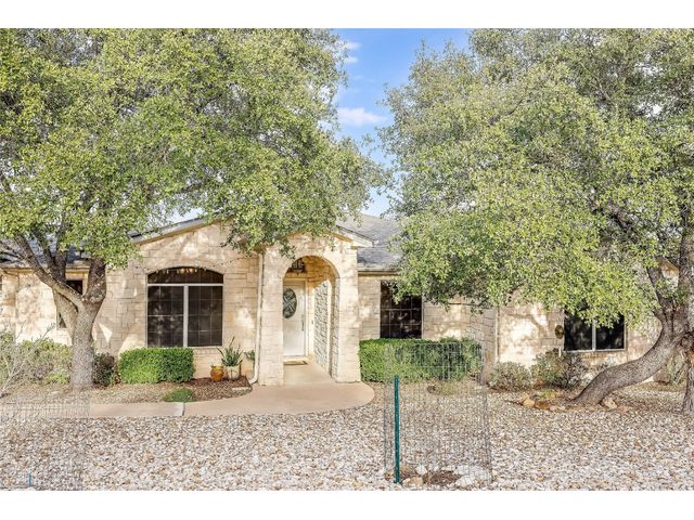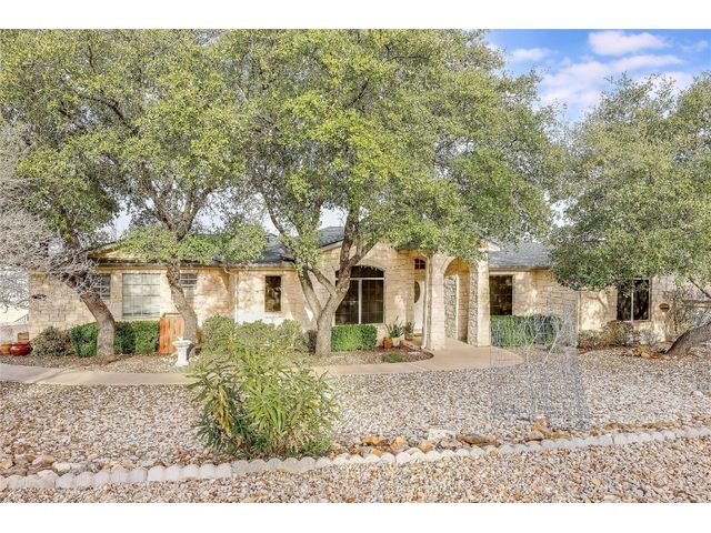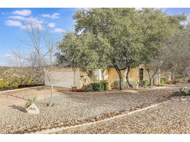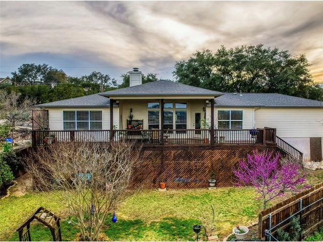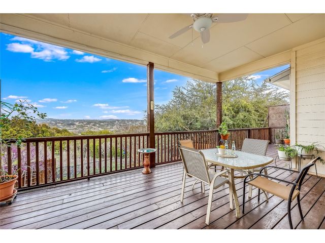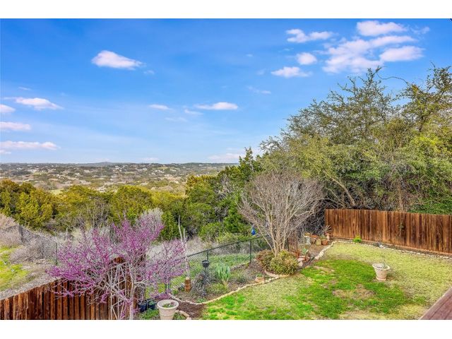Experience lake life and the scenic hill country! Splendid oak trees and a xeriscaped, low maintenance front yard offer added appeal. Upon entry through the front door, you will be allured by the large windows inviting you to take in the panoramic hill country views! For a more full experience, step out onto the massive deck for relaxation and outdoor dining, and the fully fenced backyard provides privacy and gardens. The kitchen opens to the living room, allowing for ease of entertainment. The primary bedroom continues to boast of views of the picturesque hill country, and leads into the primary bathroom which offers a double vanity and massive shower! A bonus room with French doors can be utilized as an office or dining space. The garage includes a work bench and built-in cabinets, and is plumbed for a water softener. Owning this home includes membership to the Lago Vista Property Owner's Association, allowing exclusive access to 9 private waterfront parks, basketball court, boat ramps, campground, disc golf course, fishing well, fitness center, hiking trail, marinas, parks, pavilions, pool, athletic field, tennis courts, pickle ball courts, playgrounds and more!