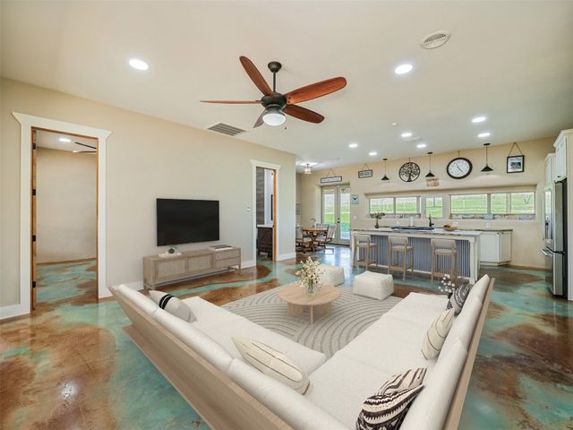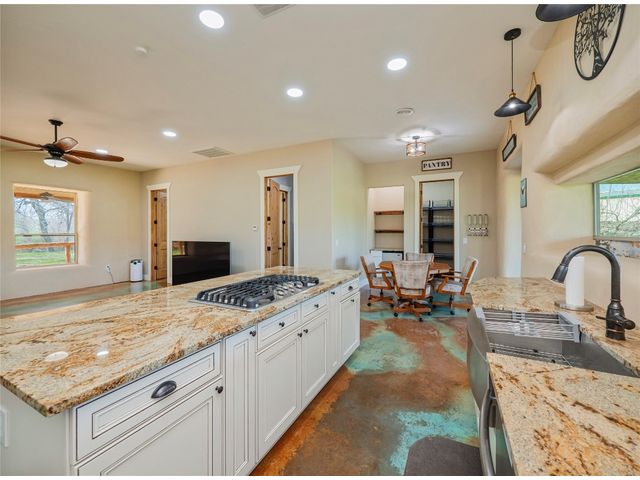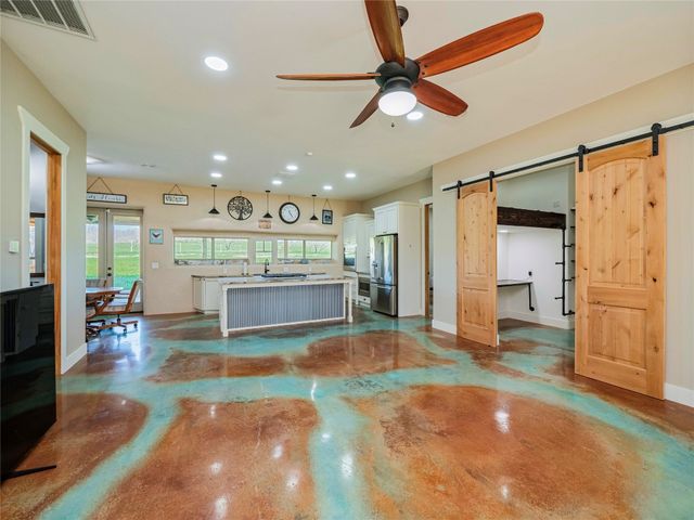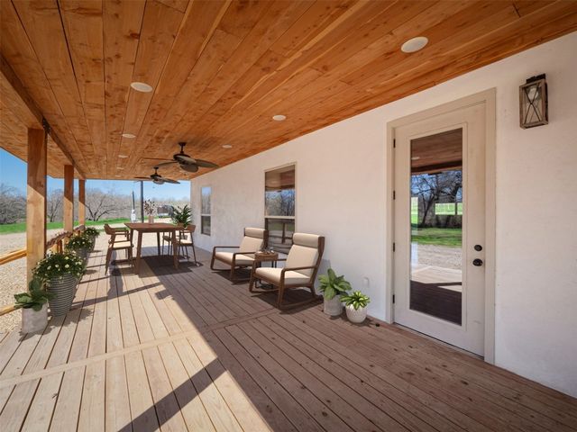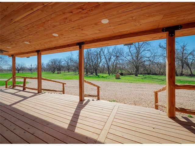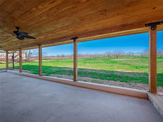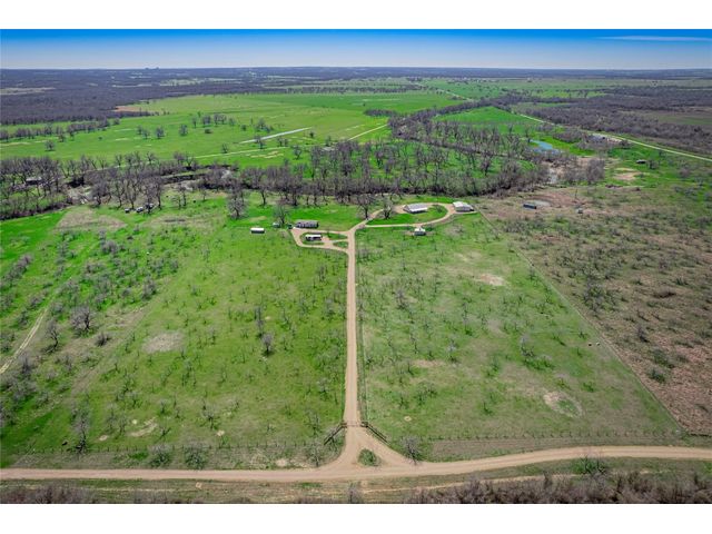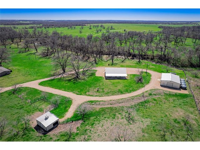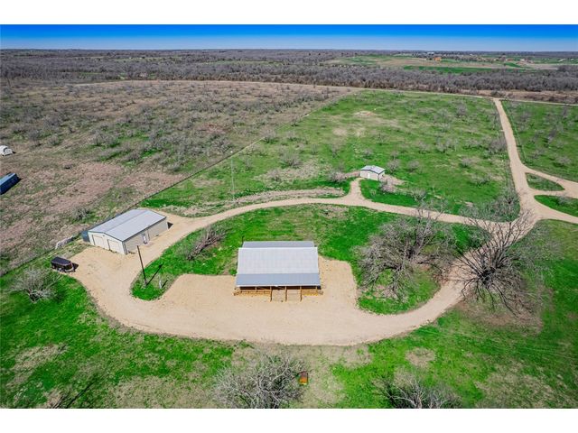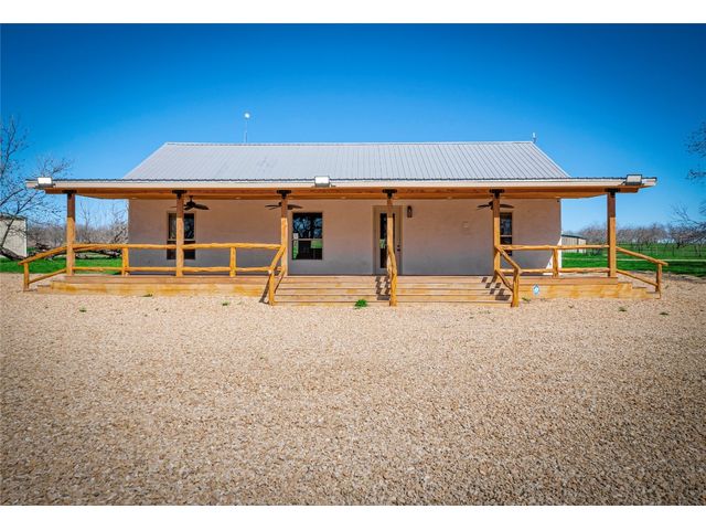 This rural home is perfect for those looking for a peaceful retreat away from the hustle and bustle of city life. Located on 10.29 acres, this spacious home features an open floor plan with stained concrete flooring throughout. The large living area is perfect for entertaining or relaxing with family and friends. The split bedroom floor plan offers privacy, with the primary bedroom featuring a walk-in shower, single vanity, and a nice size closet. The kitchen boasts an extended island with granite counters, gas cooktop, built-in oven, wet bar with wine cooler. One of the highlights of this property is the huge back porch facing the San Gabriel river. This year-round live-water feature provides opportunities for fishing, kayaking, swimming and relaxing under giant century-old pecan trees. If you enjoy working on projects or have hobbies that require extra space, there is a large 40x60 metal shop with concrete floors and dual roll-up doors. There are also four storage tanks to catch rainwater runoff. There is also a livestock barn as well as an enclosed poultry coop. The north area where the barn sits is cross fenced and ready for cattle or horses. An ag exemption is already in place to help keep taxes low on this beautiful piece of land. An automatic gate along the private road maintains privacy while providing easy access to Rockdale (10 minutes), Taylor (30 minutes), and even Austin (less than an hour). If you're looking for country living at its finest with modern amenities close by, then look no further than this stunning rural home.