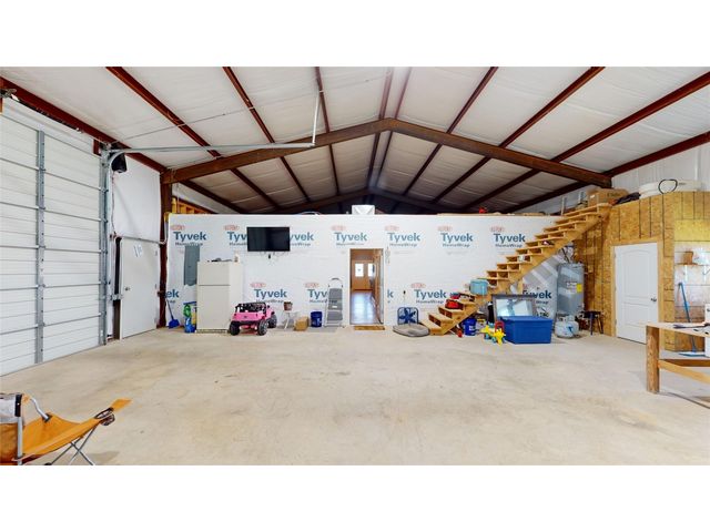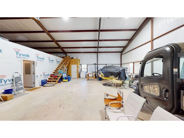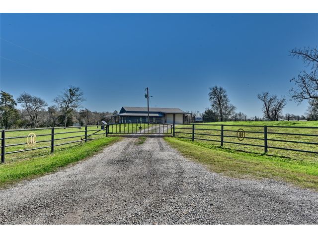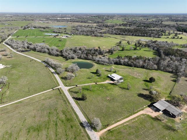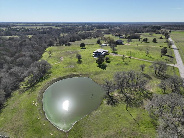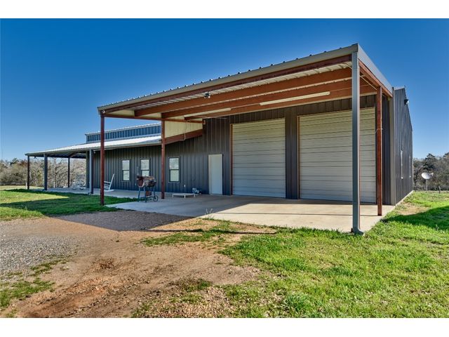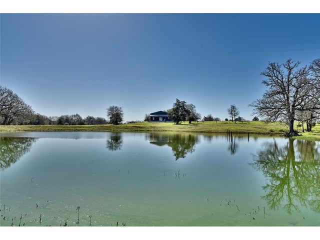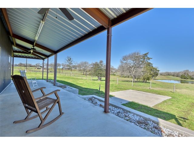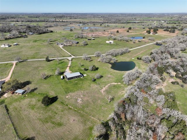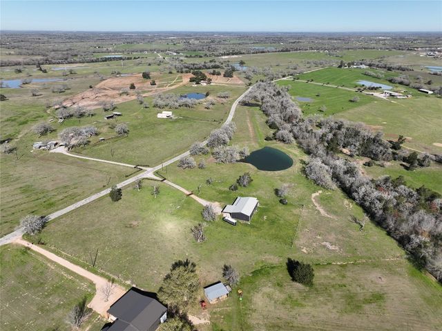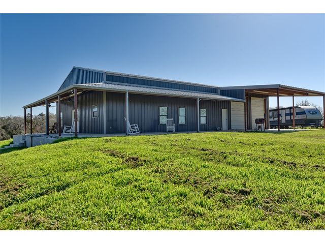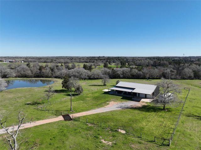 Gorgeous acreage with views overlooking 2 ponds & the countryside awaits you just minutes from Giddings, Texas! The 2020-built barndominium is a true haven of tranquility featuring comfortable living spaces & a modern design. The residence boasts 2 bedrooms w/walk-in closets, & 2 bathrooms. The primary bath has a double vanity & large walk-in shower. With its open floor plan & stained concrete floors, this home is perfect for both entertaining & living. The kitchen features quartz countertops, an oversized island, 5 burner electric range, refrigerator, & pantry. Take a stroll through the double doors to a covered porch w/ceiling fans overlooking 2 ponds & the countryside. Large 1,200 sqft garage w/loft is ideal for storage, entertaining, or to use as a workshop. Covered parking extends out from garage. Electric gate & fencing outlines the property. Mature trees scattered throughout pastures used for grazing. Conveniently located minutes from Giddings, restaurants, churches, stores, etc., this property offers the ideal country lifestyle. Lee Co Water, Bluebonnet Electric, Aerobic Septic. No minerals. Make this your own slice of Texas paradise & schedule your showing today!