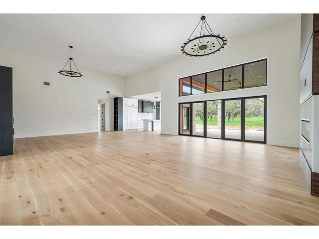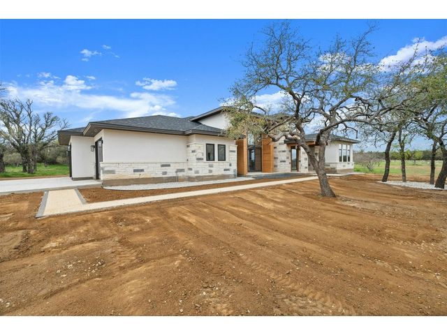 Welcome to your own slice of Hill Country paradise! Nestled on 6.76 acres of pristine land and just a short 15-minute drive from Lake LBJ, this brand-new construction offers the epitome of luxury living. Approaching the home, you'll be greeted by a stunning stone and stucco facade, complemented by a grove of trees that adds to the tranquil ambiance of the property. An extended driveway leads to the attached 3-car garage, providing ample parking and storage space. Step inside to discover an elegant 3,800 square foot interior, characterized by soaring ceilings, hardwood flooring, and crisp white walls that create a sense sophistication. Oversized windows and sliding glass doors flood the space with abundant natural light, while chandeliers add a touch of glamour throughout. The heart of the home is the massive living and dining combo, featuring a contemporary fireplace and wet bar, perfect for entertaining guests or simply relaxing in style. The gourmet kitchen is a true masterpiece of design, boasting a center island, breakfast bar, white cabinetry, quartz countertops, and professional-grade appliances including a gas range with custom vent hood and a built-in refrigerator. Two flex rooms located off the entry offer versatility for use as a home office, study, or additional living space to suit your needs. Retreat to the huge primary bedroom, complete with a walk-in closet and a bespoke en-suite featuring a quartz-topped dual vanity, a freestanding soaking tub, and a frameless walk-in shower fit for two. Three additional well-appointed en-suite bedrooms provide comfort and privacy for family and guests. Convenience is key with a half bath, laundry room with built-ins, and a mudroom providing organization and functionality. Outside, the massive covered back patio beckons for al fresco dining and relaxation, overlooking the picturesque landscape surrounding the home. The solar panels provide huge energy savings year round. Schedule a showing today!