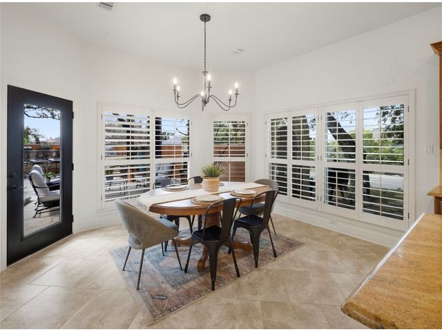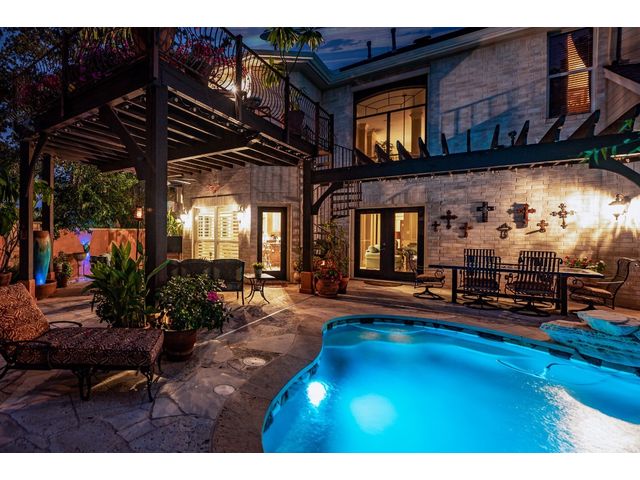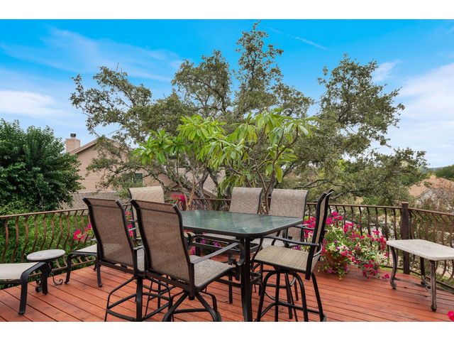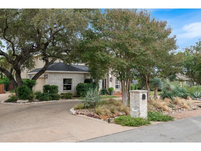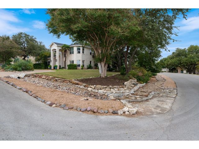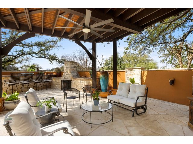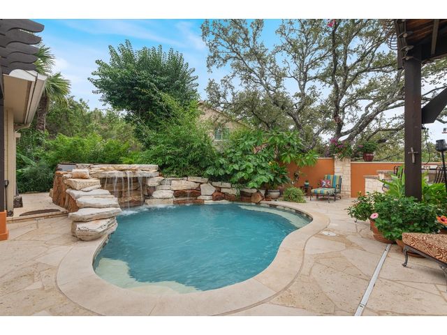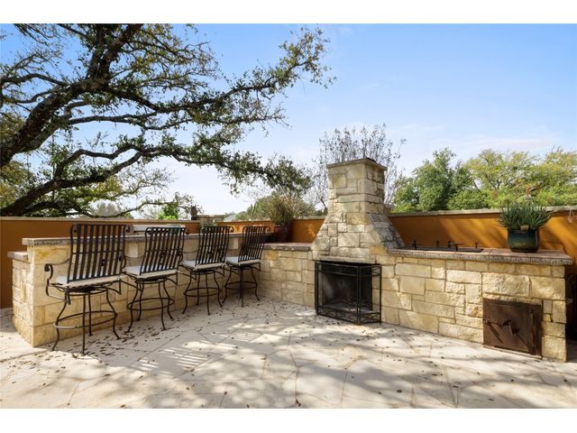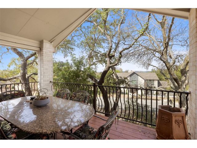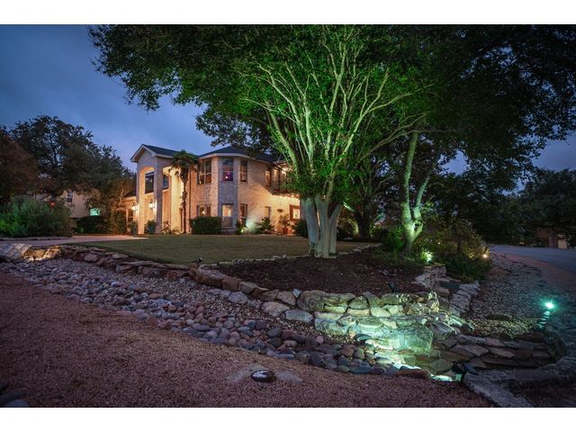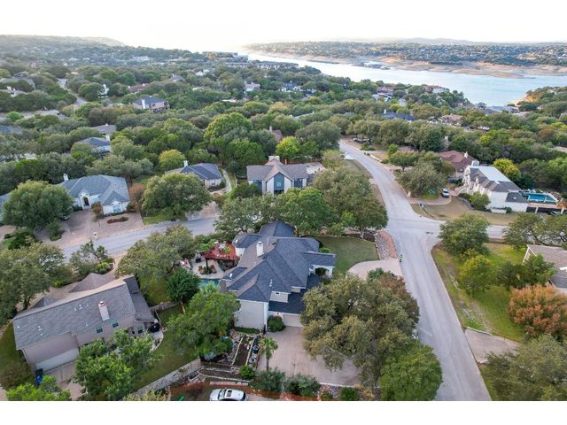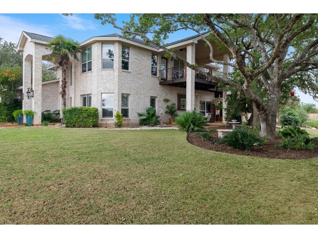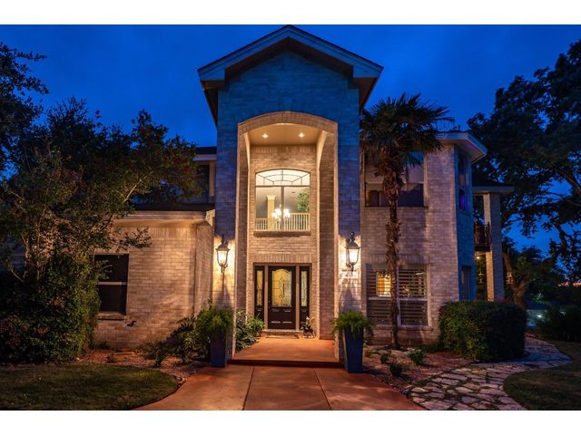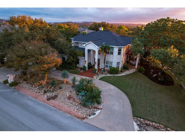 One-of-a-kind custom home in coveted Old Lakeway nestled on a .309-acre corner lot with 180° panoramic hill country and partial lake views from the second level, & incredible indoor/outdoor entertaining areas including a stunning private pool, outdoor kitchen, Spanish-style courtyard, & 2nd-floor terrace. This amazing property offers the peace & quiet of tranquil living all while in the heart of Lakeway, within 5 minutes of the Lakeway City Park, the Lakeway Marina, the World of Tennis, & the Hills Country Club. The stately brick residence offers 3,606sf of open-concept living space featuring high ceilings, beautiful travertine-look tile & wood flooring, custom built-ins, elegant moldings, plantation shutters, & more. Enjoy a main-floor formal dining room, a spacious living room with a gas log fireplace, & a gourmet eat-in kitchen complete with center island, breakfast bar, granite countertops, under & over cabinet lighting, built-in refrigerator, wine fridge, & gas cooktop. The primary suite is also located on the main floor with wood flooring, a large walk-in closet, & a private en-suite bath with a marble-topped dual vanity, Japanese soaker tub, & walk-in shower. The 2nd floor hosts 3 additional beds, 2 baths, a home office with custom built-ins, & a large entertainment room with wet bar & access to the private terrace. The backyard retreat is beautifully landscaped with a Caribbean/Tahiti resort atmosphere & is surrounded by a Tuscany stucco wall with sconce lighting providing privacy for all your outdoor entertaining. The backyard also boasts a stunning in-ground pool with bench seating all the way around & fun water features, a separate heated spa, outdoor fireplace, wood-burning smoker & grill, an outdoor kitchen, sitting area around the TV, & a separate dining area. This unique home offers an unparalleled living experience in one of the most sought-after neighborhoods in Old Lakeway. Don't miss out on the chance to make this unique home your own!