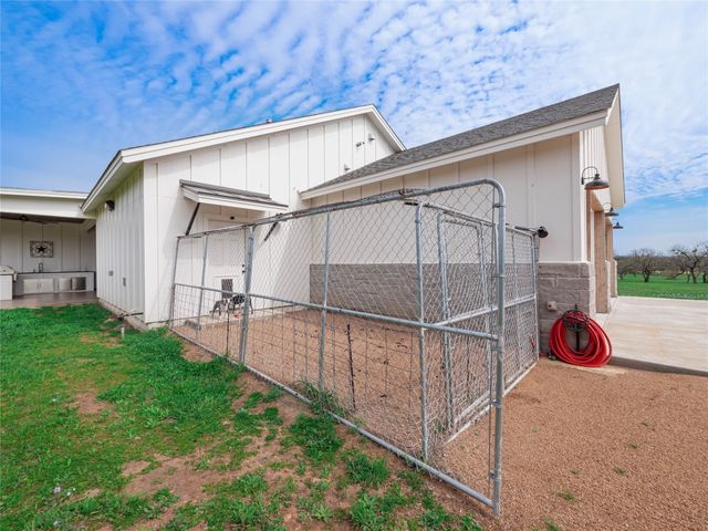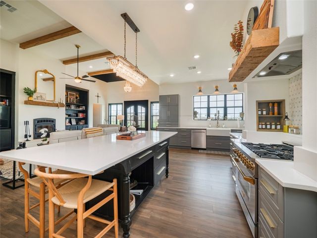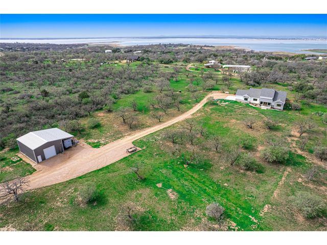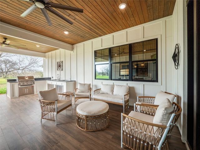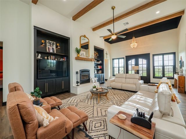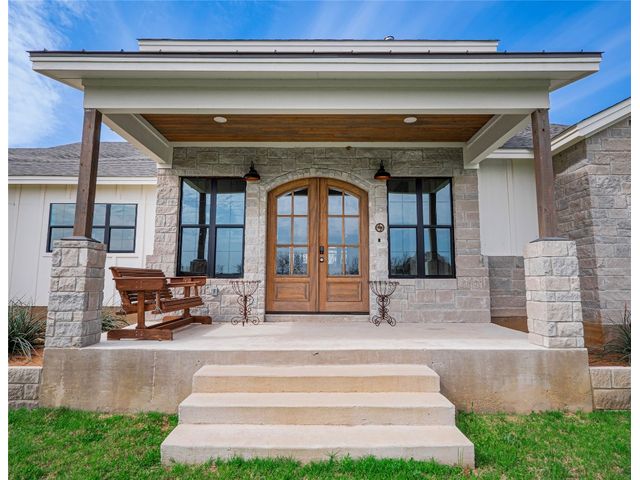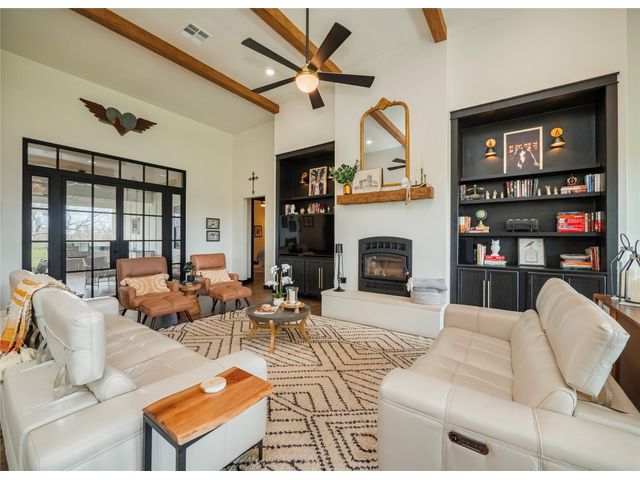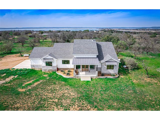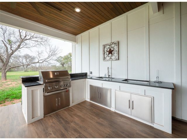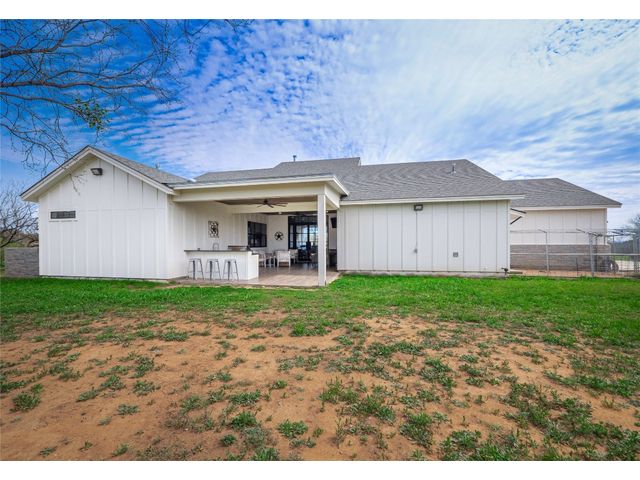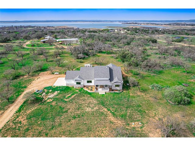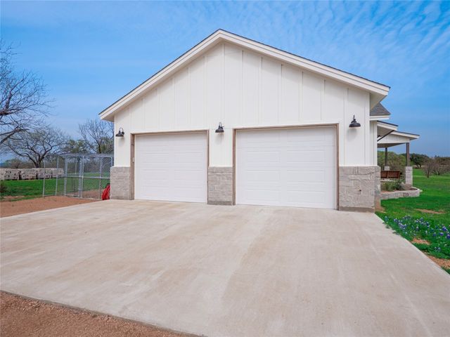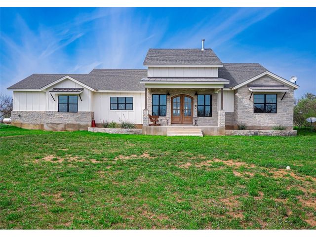 This gorgeous, custom-built home in the Granite Hills subdivision in Burnet is a stunning 3 bed, 2.5 bath property with over 2552 square feet of living space. Situated on a spacious 5-acre lot, this home offers plenty of privacy and room to spread out. As you enter the home, you will notice the attention to detail and high-end finishes throughout. The kitchen is truly a chef's dream with a 6 burner propane convection oven, built-in microwave drawer, and a large island with quartz countertop and electricity. The kitchen also features quartz backsplash, pot filler, and ample storage space. The open concept living area boasts 14-foot ceilings and wood beams for added character. An electric fireplace in the third bedroom adds warmth and charm to this already inviting space. One unique feature of this home is the mud room inside the garage door - perfect for storing shoes or other items when coming inside from outside activities. The laundry room also has its own sink for added convenience. The master bedroom is not only spacious but also includes soundproofing in its walls for additional peace and quiet. The en-suite bathroom features a large wet-room with shower and soaking tub that is wheelchair accessible. Outside, there is plenty of space to entertain or relax on the covered patio which includes an outdoor kitchen complete with grill & sink w/granite countertops. There's even electricity & propane setup for future use such as adding a pool or hot tub. In addition to the attached garage that can accommodate two F250 trucks, there's also a separate metal building on-site that measures 30 x 40 feet! This building has its own septic system set up for water/electricity & an awning specifically designed for RVs - including a convenient 50 amp plug! Other notable features include water softener system, tankless hot water heater, backup generator with plug and propane fuel supply, and a setup for electricity & propane for future use.