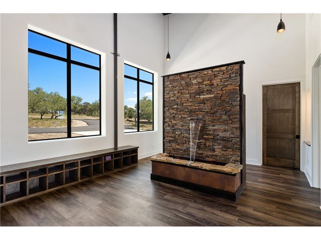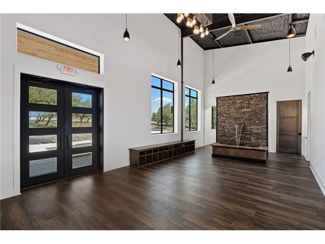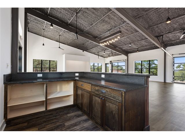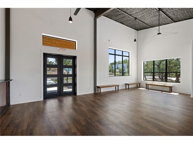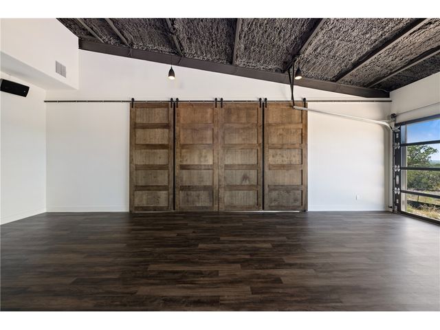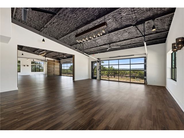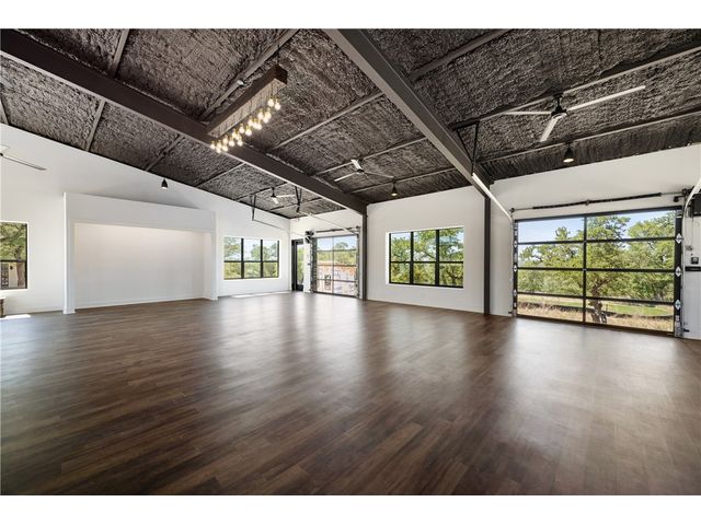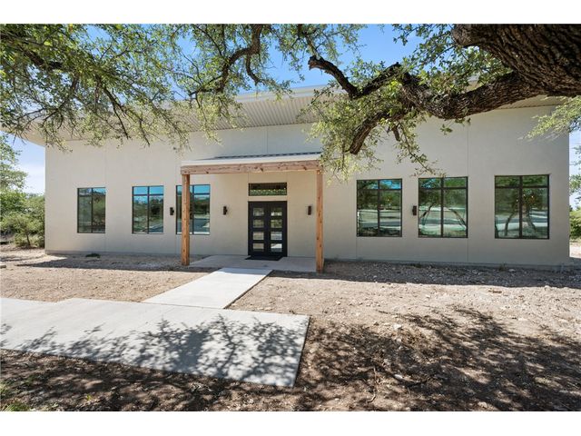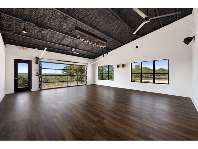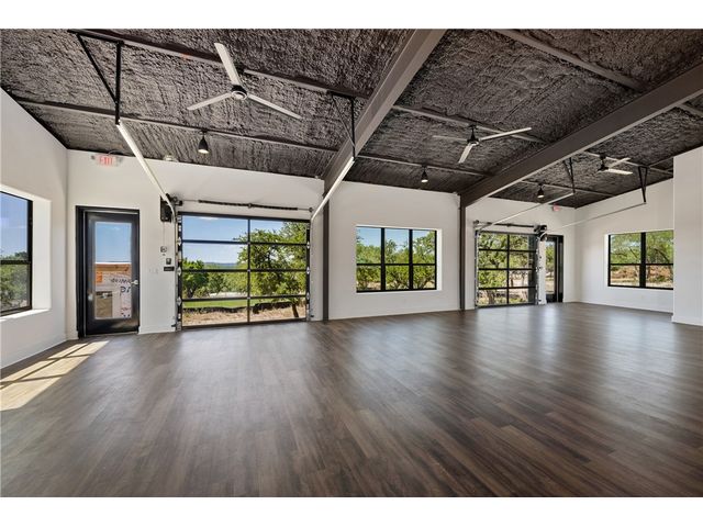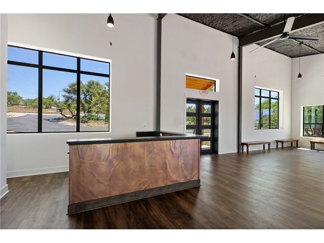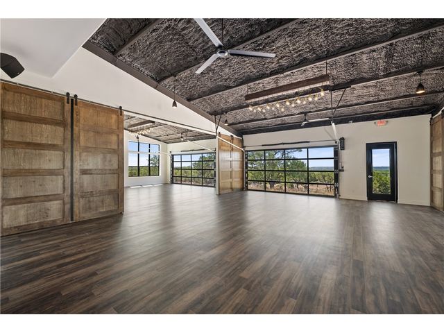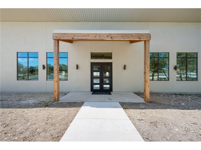 This desirable location with heavy traffic and panoramic long-distant sunset views is perfect for your business. An unrestricted 10 acres with over 400 ft of frontage on Fitzhugh across from Jester King Brewery, near Distillers and outdoor eateries. Currently used for events and yoga studio, this property offers numerous opportunities such as a wedding venue, tasting room, spa retreat center- the possibilities are endless. Two steel buildings, with stucco facades nestled between trees feature amazing views out the back seen through ample windows and glass motorized doors that brings the Hill Country inside. The larger building is 4,000 sq ft and features 3 separate rooms, with a lobby, 3 full restrooms, 2 showers, a prep kitchen with gas range, washer/dryer combo, sink and refrigerator. All countertops are black leathered granite and showers have black basalt tiles 8’ up the walls. There is a 4-zone audio system with Bluetooth and mic panels in each of the three rooms and all rooms are separated by large double barn doors including from the central room to the lobby allowing for the whole place to be opened or separated into any combination. The second building is 2,000 sq ft and has just one large open space with a front counter, 2 bathrooms and a storage room. There is a large artificial turf installation of 2,400 sq ft directly behind the smaller building. A 30,000-gallon rainwater tank connects both buildings with a possible 140,000 gallons that can be caught per year from the average rainfall in the area.