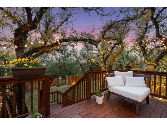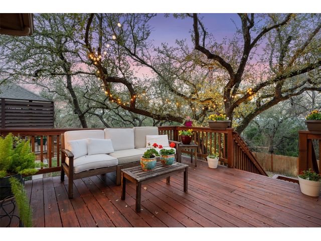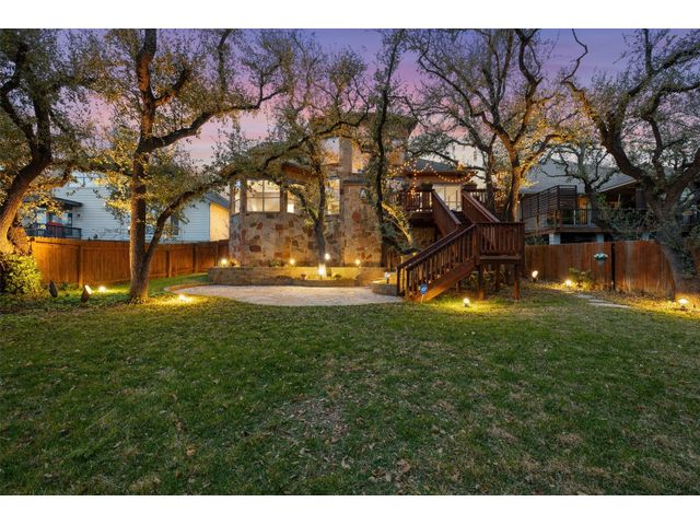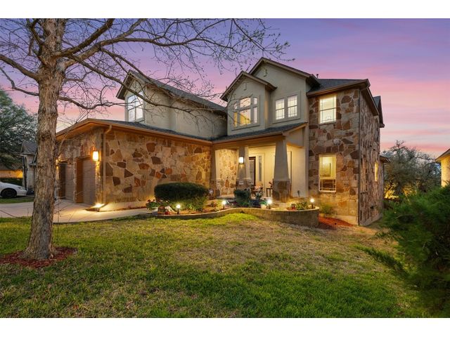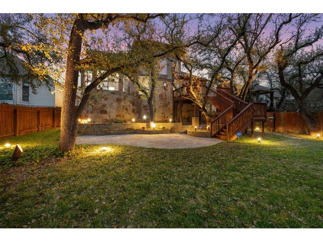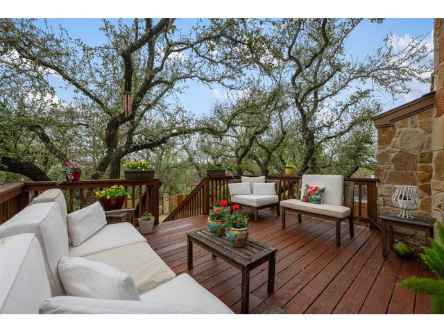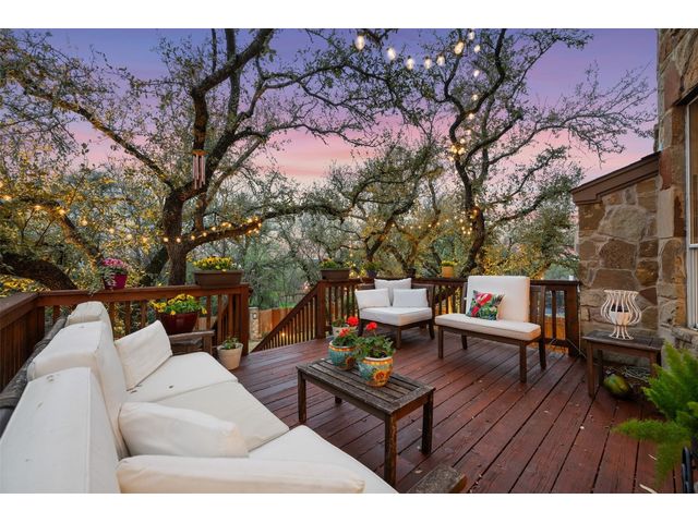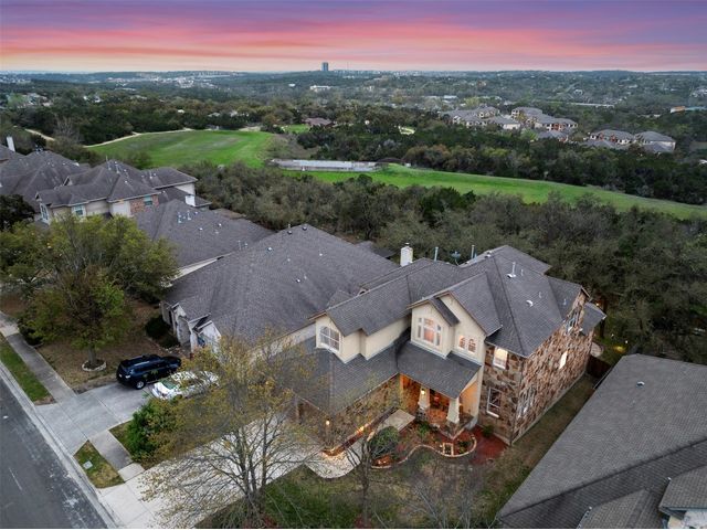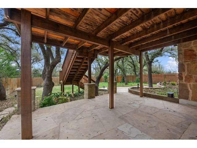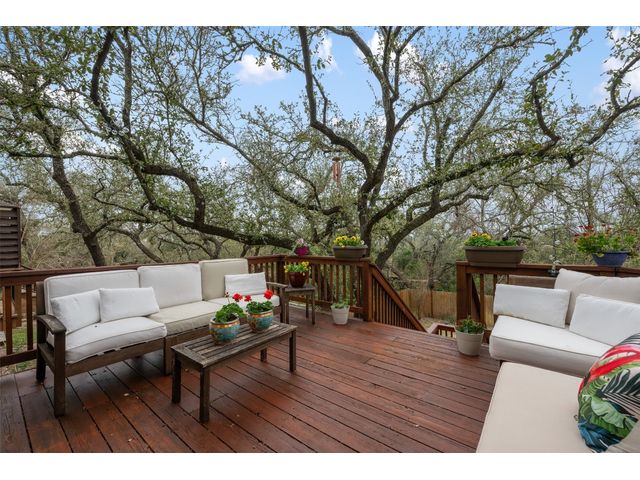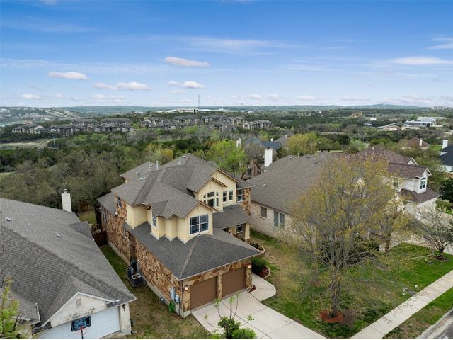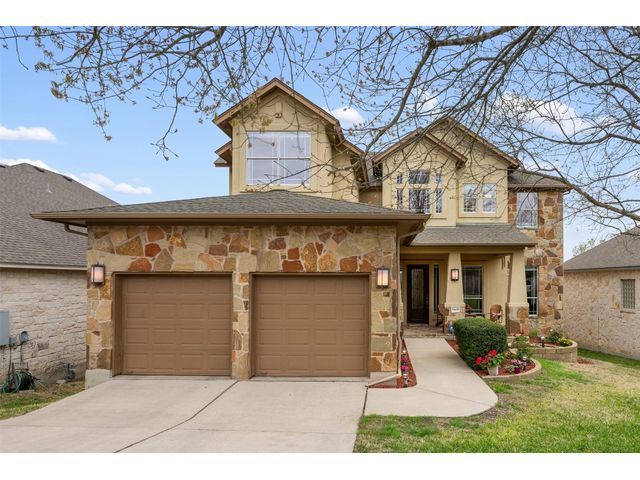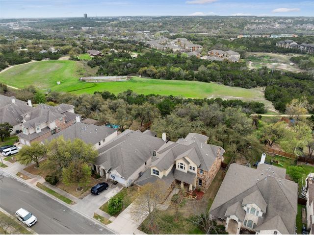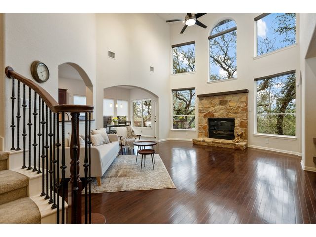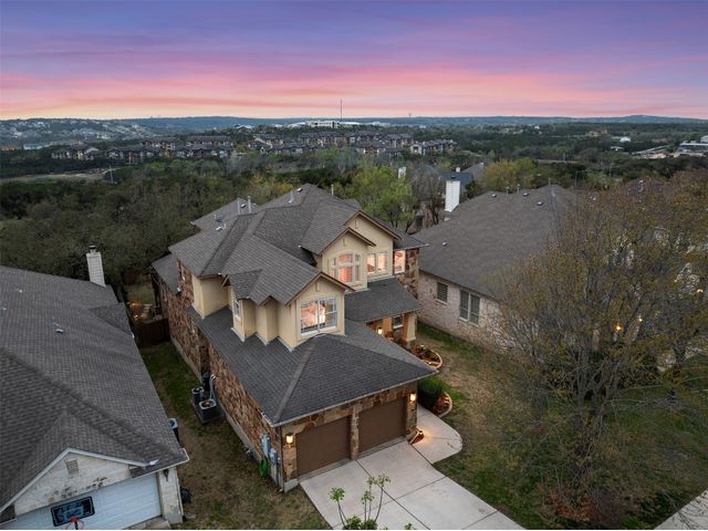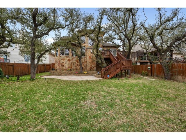 This scenic home, nestled among majestic oaks, is one of the crown jewels of Travis Country West. Imagine relaxing on the back deck and enjoying picturesque views of the woodlands and foliage of a greenbelt. This home is stately, warm, and inviting all at once. Upon entering, large cathedral windows provide a view of the tranquil deck and lovely backyard setting. To the left is a formal dining room and to your right is an elegant office with built-in wood shelving and large windows that face a welcoming front porch. In the living room, two-story high ceilings flow into the open kitchen space, making for ease of entertaining. The primary bedroom is tucked away on the first floor with ample windows to savor the abundant backyard trees and scenic greenbelt. The primary bathroom is private and spacious. Circling up to three other bedrooms and a media-ready den area, you’ll find ample room for the family. The backyard has multiple spaces to unwind, including a stone terrace and a covered and shady game area. A backyard gate leads to a two-mile walking and running trail, complete with exercise stations. The trail also takes you to the neighborhood pool and park area. At night, from the elevated deck, living room, and master bedroom, you look down on a beautifully lighted and landscaped backyard, and on cold days or nights you can flick a wall switch and enjoy a cozy fire in front a huge, gas-fueled stone fireplace. A two-car garage comes with built-in cabinetry, storage space, and a long countertop for doing those odd jobs. This is a great, must-see house. Stop by for a visit so we can welcome you home!