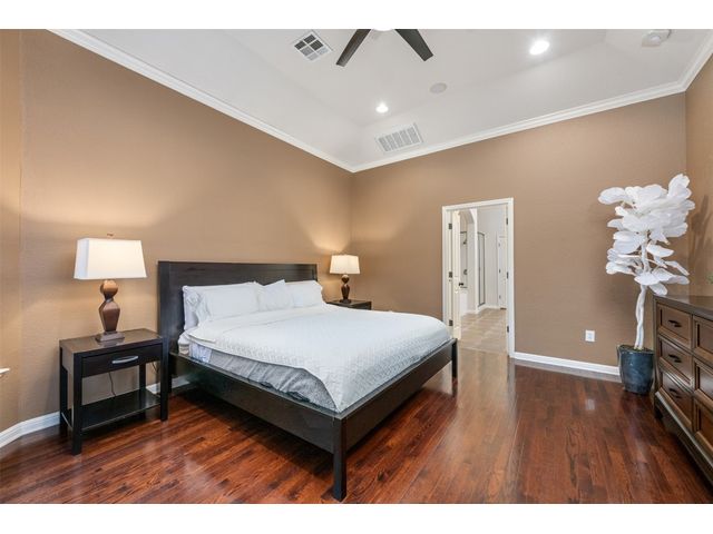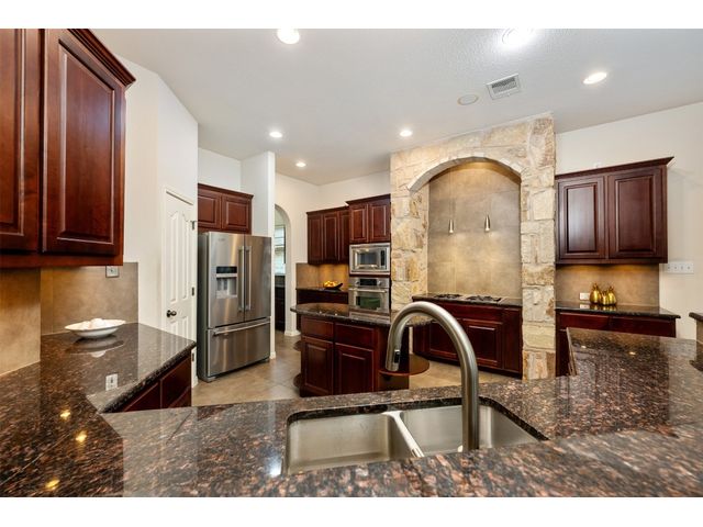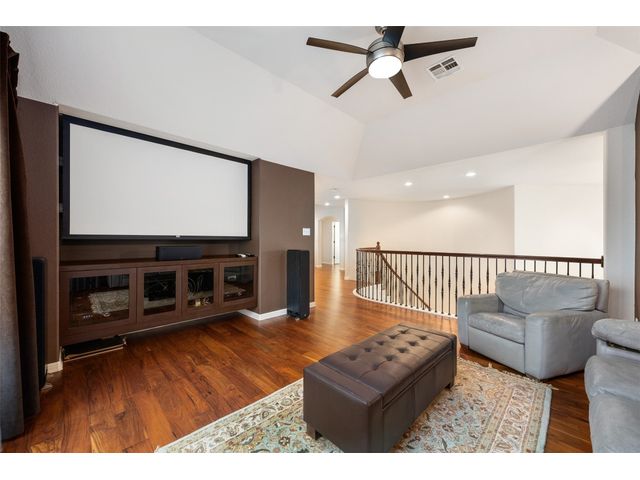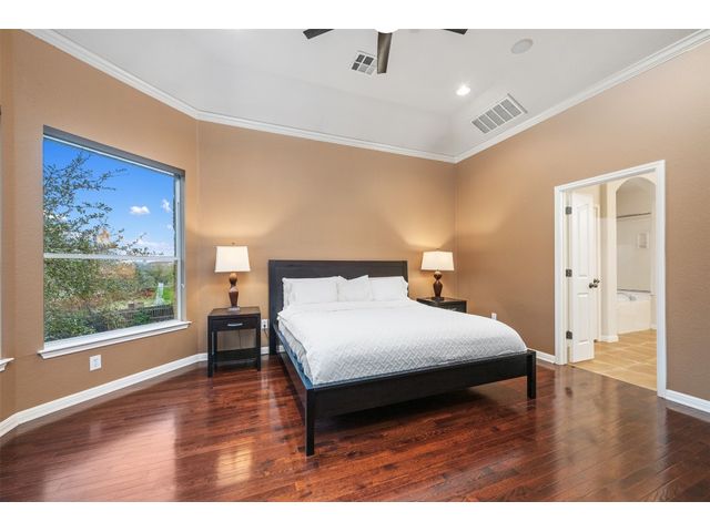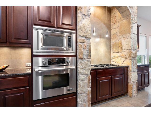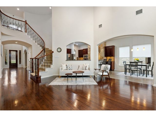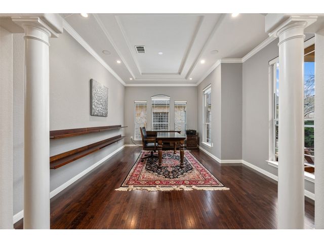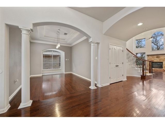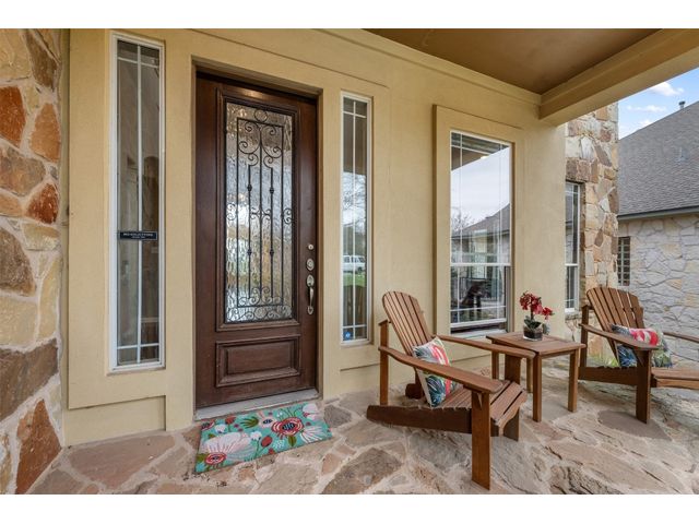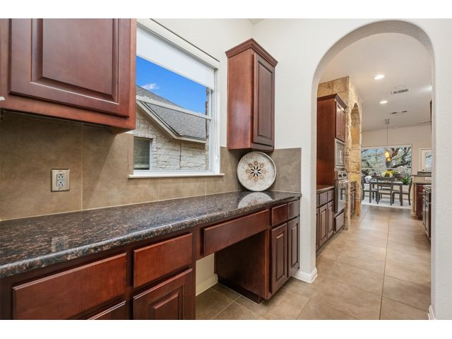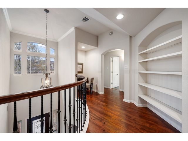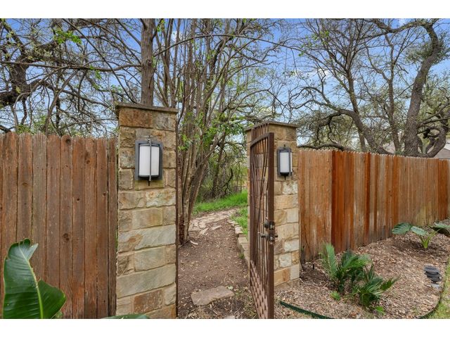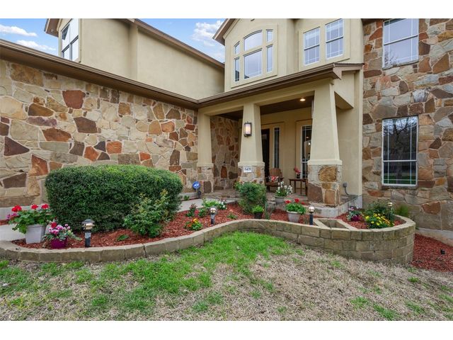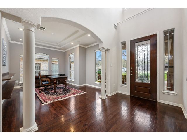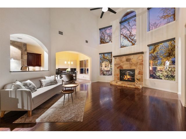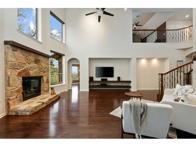 This scenic home, nestled among majestic oaks, is one of the crown jewels of Travis Country West. Imagine relaxing on the back deck and enjoying picturesque views of the woodlands and foliage of a greenbelt. This home is stately, warm, and inviting all at once. Upon entering, large cathedral windows provide a view of the tranquil deck and lovely backyard setting. To the left is a formal dining room and to your right is an elegant office with built-in wood shelving and large windows that face a welcoming front porch. In the living room, two-story high ceilings flow into the open kitchen space, making for ease of entertaining. The primary bedroom is tucked away on the first floor with ample windows to savor the abundant backyard trees and scenic greenbelt. The primary bathroom is private and spacious. Circling up to three other bedrooms and a media-ready den area, you’ll find ample room for the family. The backyard has multiple spaces to unwind, including a stone terrace and a covered and shady game area. A backyard gate leads to a two-mile walking and running trail, complete with exercise stations. The trail also takes you to the neighborhood pool and park area. At night, from the elevated deck, living room, and master bedroom, you look down on a beautifully lighted and landscaped backyard, and on cold days or nights you can flick a wall switch and enjoy a cozy fire in front a huge, gas-fueled stone fireplace. A two-car garage comes with built-in cabinetry, storage space, and a long countertop for doing those odd jobs. This is a great, must-see house. Stop by for a visit so we can welcome you home!