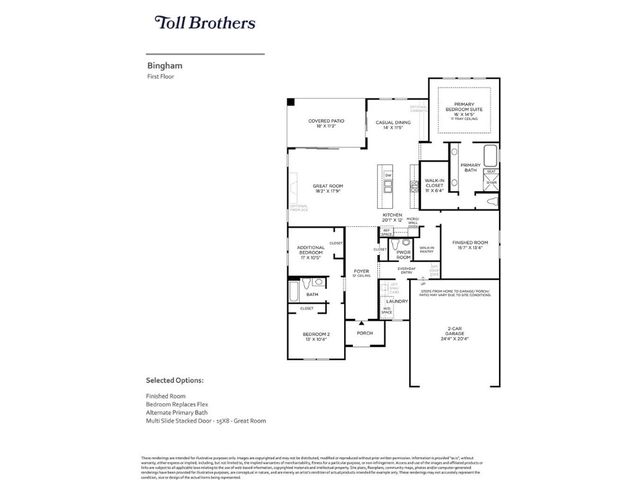 MLS# 3491299 - Built by Toll Brothers, Inc. - Ready Now! ~ The Bingham Transitional features a contemporary stucco exterior with a covered front porch entry. The elongated foyer is flanked by a short hall that leads to two bedrooms and shared hall bath. The open great room boasts a multi-slide door that opens to the covered patio to expand living space to the outdoors. The well-appointed kitchen with stainless steel appliances, center island, casual dining space and a large walk-in pantry will impress any chef. The versatile flex room provides added space to create the room you need to fit your lifestyle. Relax in the primary bedroom suite enhanced with a decorative tray ceiling and luxurious bath with a dual sink vanity, separate tub and shower, and sizable walk-in closet. Located in a 55 community with resort-style amenities, this is single-story living at it's finest.
