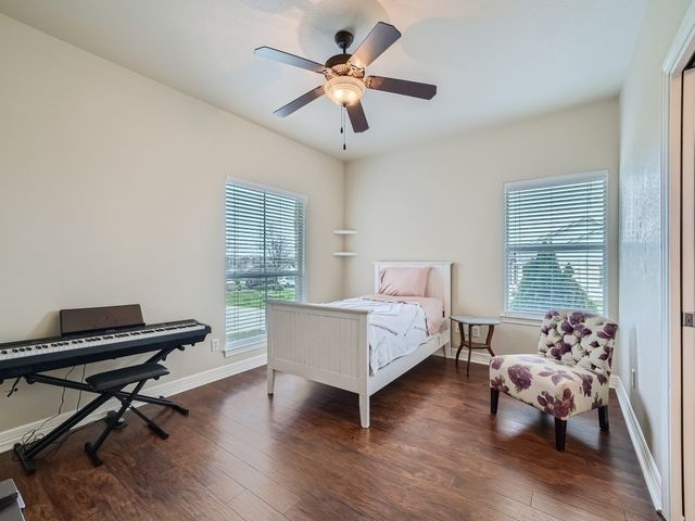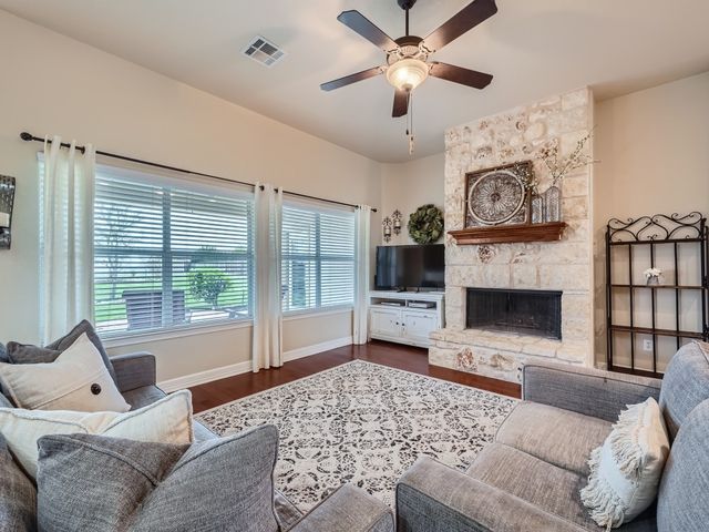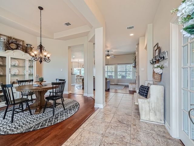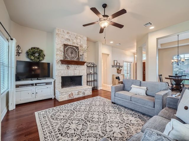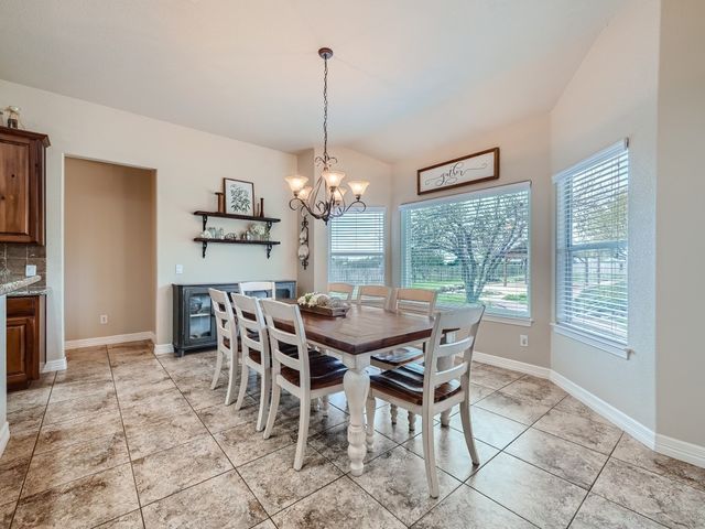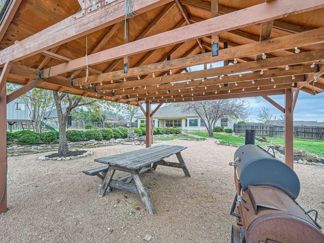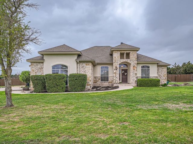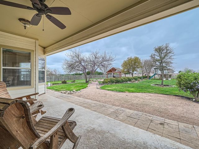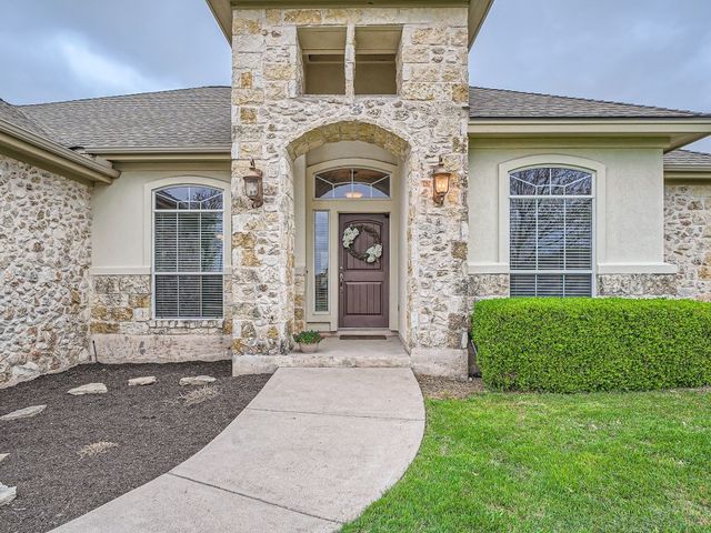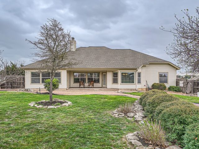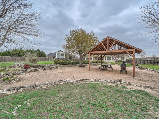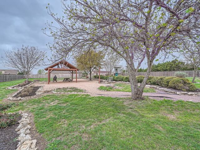 Step into luxury living with this stunning 2008 home nestled on a serene 1-acre lot. Offering 2,468 square feet of meticulously crafted space. Entertain in style in the formal dining room, or retreat to the expansive primary bedroom retreat, featuring dual walk-in closets, and an en-suite bathroom complete with a walk-in shower, garden tub, & dual sinks atop a long vanity counter. Enjoy seamless connectivity throughout the home with a full view from the office/playroom across the open-concept living area, offering panoramic views through the large back windows into the picturesque backyard oasis. The separate office has French doors, ideal for seamless remote work. The spacious kitchen is a delight, boasting abundant counter space, a center island, service counter, wall oven, & cooktop, complemented by a charming breakfast area nestled beside a bay window. Experience luxury at every turn with wood floors adorning the guest bedrooms, while the entire back of the home is adorned with expansive windows, welcoming ample natural light and providing breathtaking views of the lush backyard oasis featuring fig, peach, plum, and pomegranate trees, alongside vibrant rose bushes and mature Red Bud, Oleander, and Mountain Laurel trees. Indulge in outdoor living with a fire pit, pavilion, children’s playhouse, and storage shed, all amidst the privacy of your own 1-acre sanctuary. Conveniently located just 5 minutes from downtown Liberty Hill, where charming local restaurants, annual festivities, & boutique shopping await. Explore the nearby city park, with soccer fields, a football field, a playful playscape, walking/running paths, & a pristine new city swimming pool, all just 3 minutes away. With easy access to essential amenities including physician offices, dentists, pediatricians, and veterinarians within a 5-10 minute drive, this home offers both tranquility & convenience.