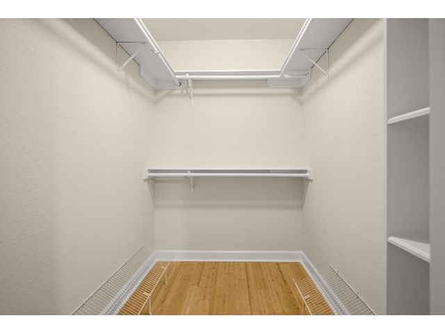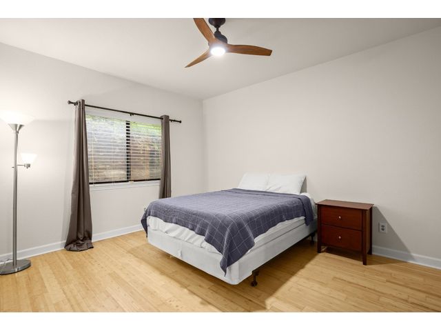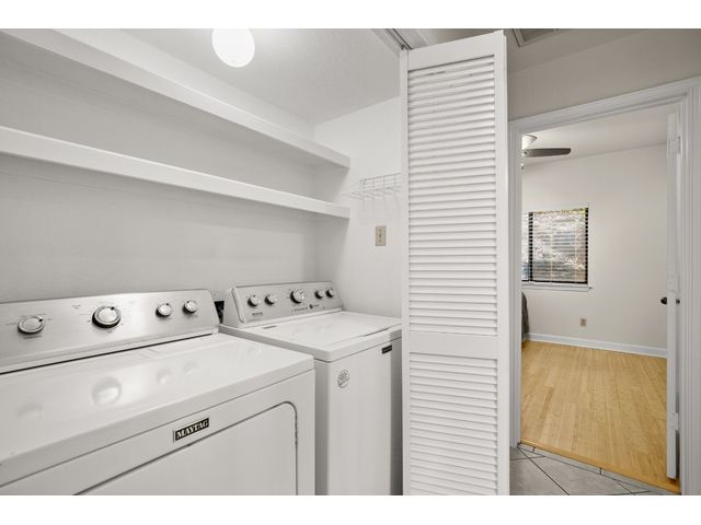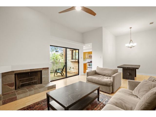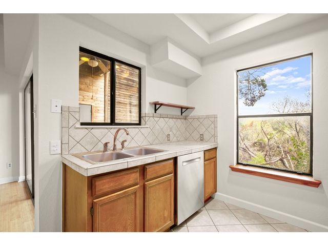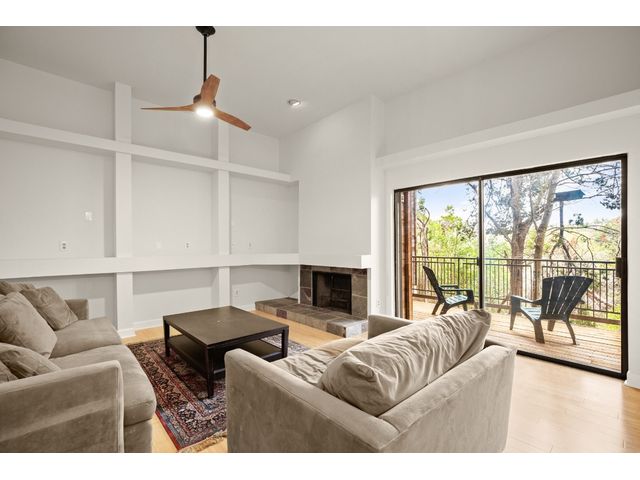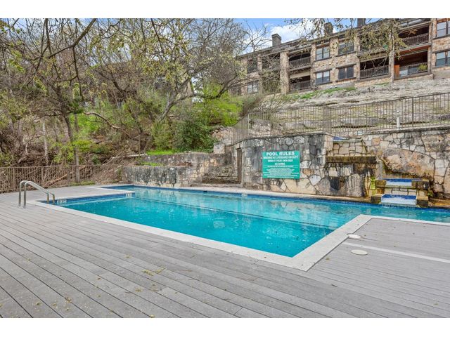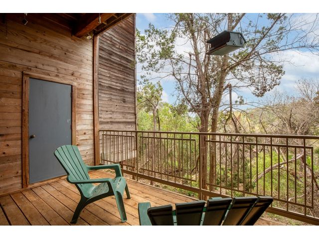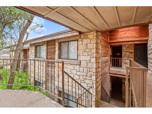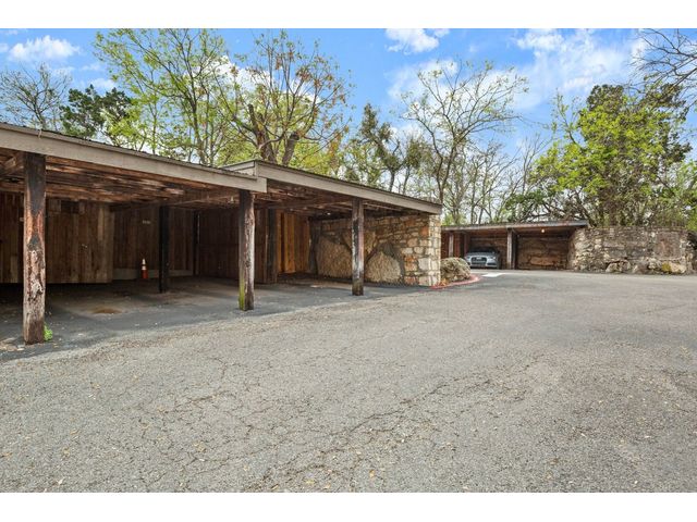 Peaceful views of the canyon and nature await you in this open concept, 2 bedroom, 1 bathroom condo with a true tree-house feel. Living and dining rooms feature soaring 10 feet+ ceilings with many built-ins. Large glass sliding door leads to your own covered, private deck to enjoy a beverage and watch the wildlife. Bamboo floors and large format tile throughout are low maintenance, no carpet here! Bathroom updates include subway tile surround, tile floors, Silestone countertops, and vanity with loads of storage. Primary bedroom has an oversized walk-in closet. Stainless Steel appliances. HVAC replaced approx. 5 years ago. Water Heater 2023. Developed by Austin renowned Larry Peel, Neely's condos have something to offer everyone! TWO swimming pools with views of the canyon and clubhouse await. Ample parking. Includes one reserved carport. Condo has been freshly painted (walls/trim/ceilings) throughout and ready for the new owners! Close to downtown Austin & The Arboretum, 183, MopPac, Loop 360, Gateway & Domain
