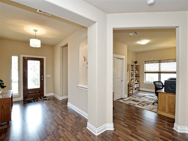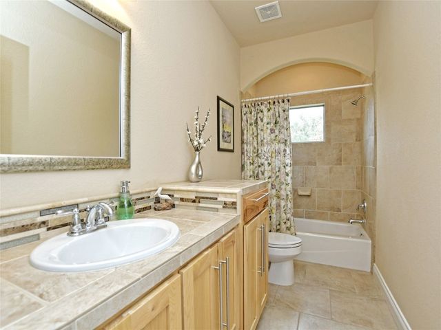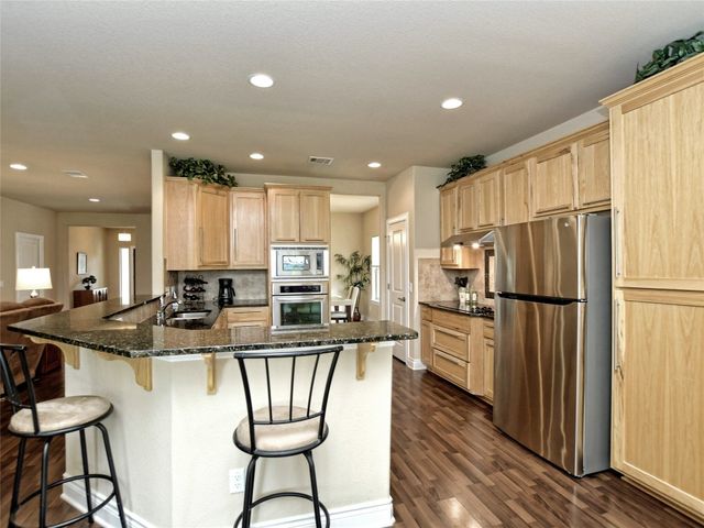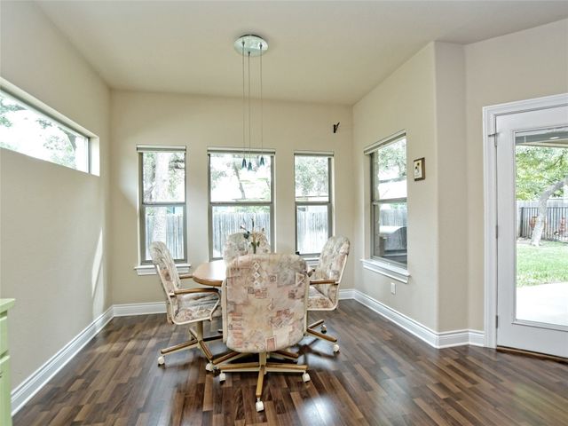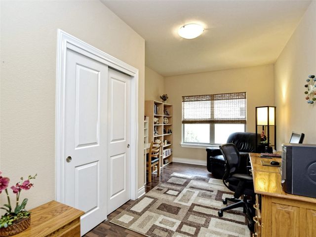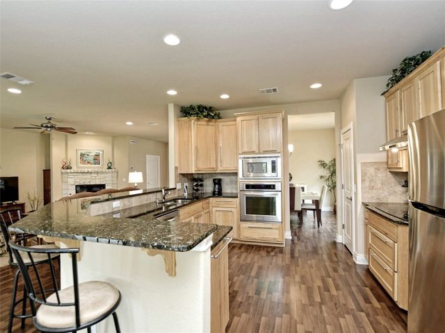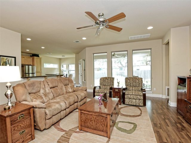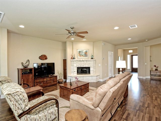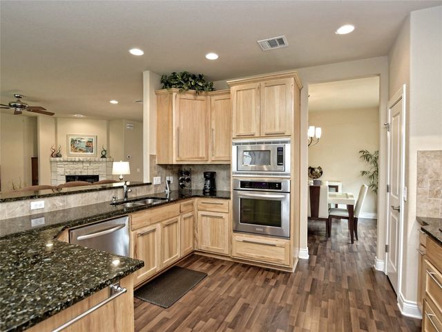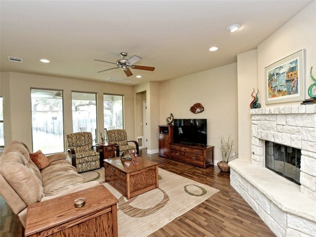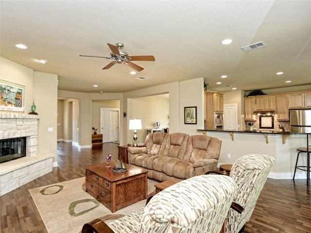 Bring your picky buyers - Priced to Sell! Impeccable home in Georgetown's premier active adult community, Heritage Oaks. Floorplan offers flexible living arrangements. Study can be second living area and a second dining area that can also be a flex space. 2 Bedrooms, 2 Full bahts. Hard surface laminate flooring in all areas except bedrooms. Living room is anchored by a gas log fireplace. A large wall space adjacent to the fireplace is perfect for your entertainment equipment and furniture. Large windows allow lots of light and most of these windows have the adjustable up / down blinds. Kitchen features abundance of storage with pull out drwers under most cabinets. Stainless steel appliances, granite counters and a large breakfast bar. The master suite is oversized and offers a private view of the back yarad. The master bath has dual vanities plus a dressing table - oh! did I mention the walk-in shower. Glass block shower with dual shower heads and a sitting bench. Secondary bedroom is split for privacy. A guest bath is just steps away with a designer tile surround shower. The covered patio extends the entire length of the back of the home. Come see why Heritage Oaks should be your Active Adult community.