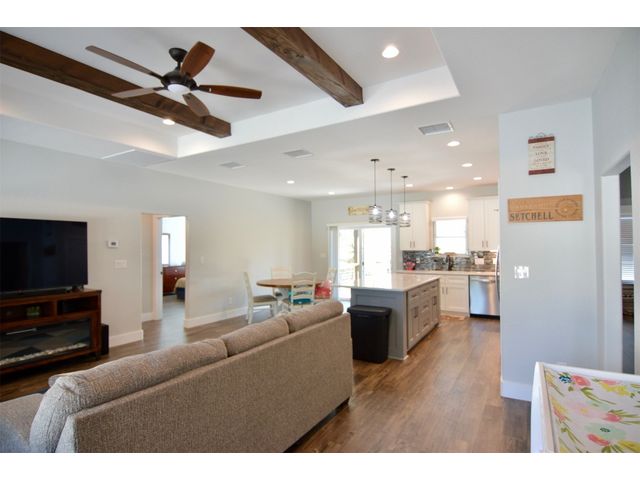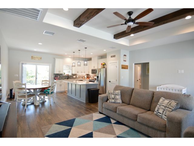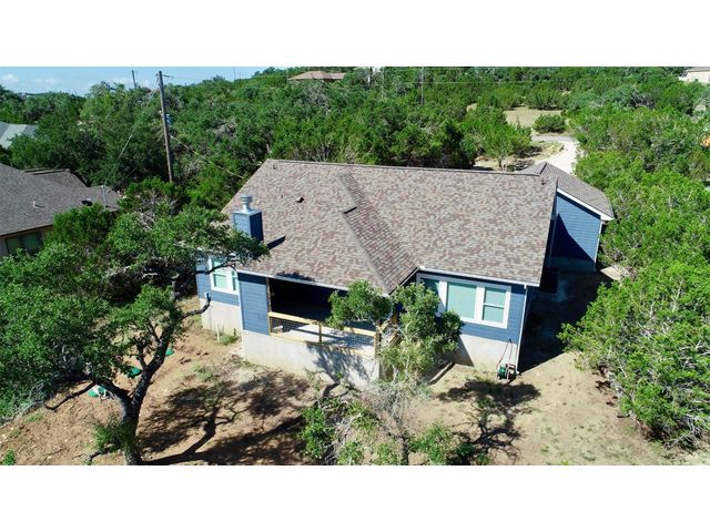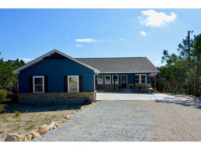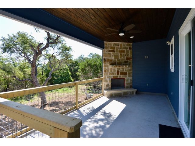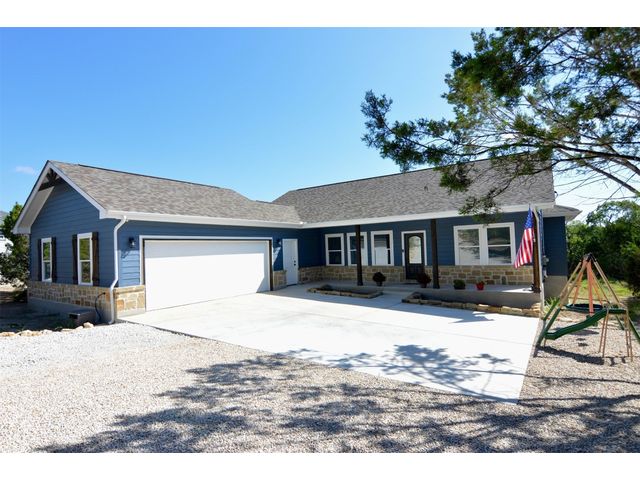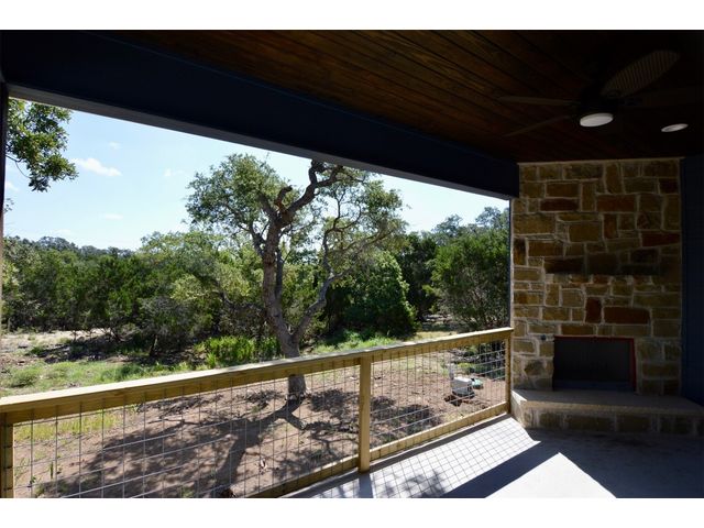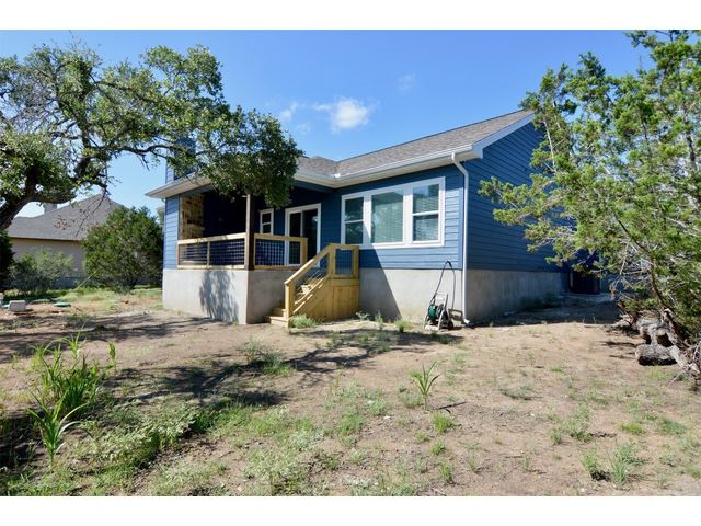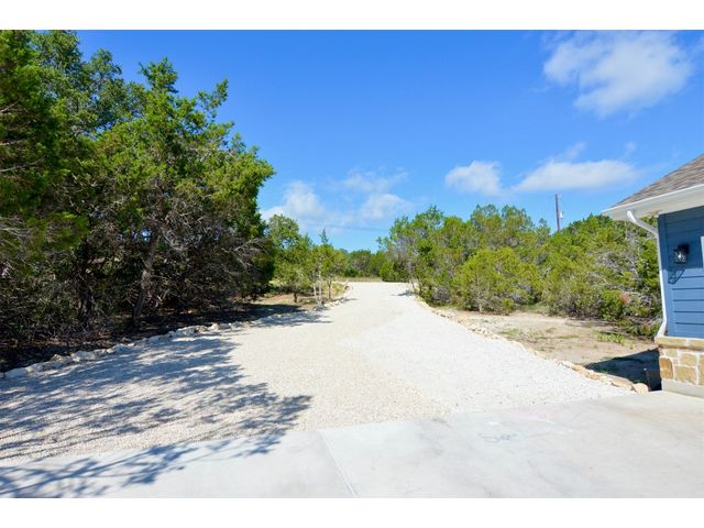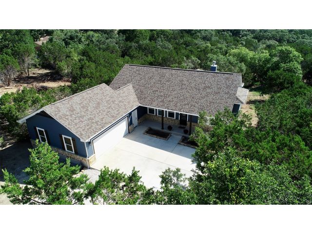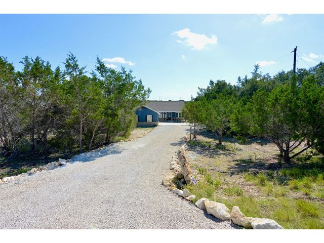 MOTIVATED SELLER! DON'T MISS THIS ONE! This like-new Texas Hill Country Cottages home is an absolute jaw dropper with many custom finishes! Sitting on a lovely .7 acre lot with a private back yard in the highly desired community of Rancho Del Lago; this 1552 sq ft, 3 bed/2 bath/2 car garage home includes custom finishes and upgrades galore! Quartz countertops throughout, custom tile, wood-look plank flooring, solid wood cabinetry with soft-close doors & drawers, full stainless Whirlpool appliance package, upgraded plumbing & electrical fixtures, upgraded insulation and more! The already high 9 ft ceilings throughout bump to 10 ft in the master bedroom, and living room, and living room boasts wood-wrapped beams. Large sliding glass doors lead you to a huge covered back patio with a stone-faced, propane-starter fireplace, enabling you to enjoy a peaceful and private back yard experience.