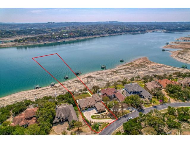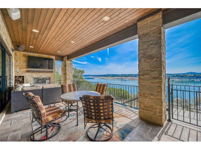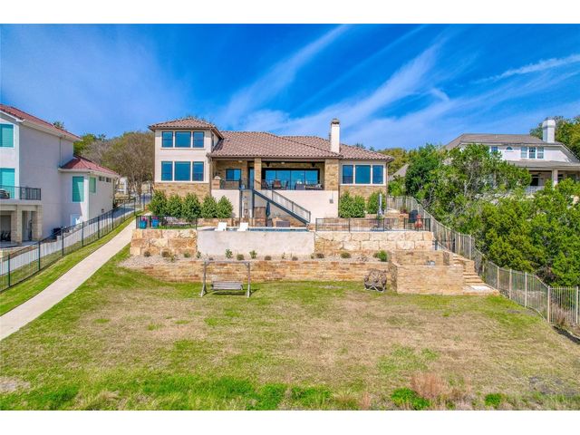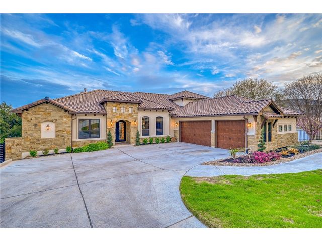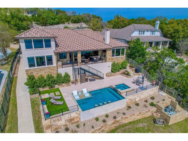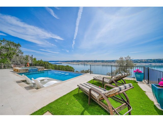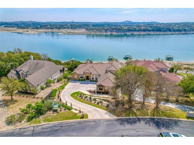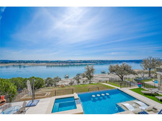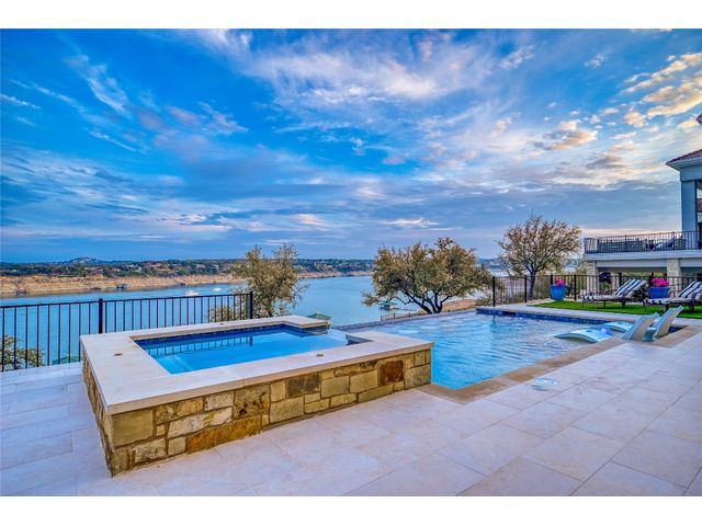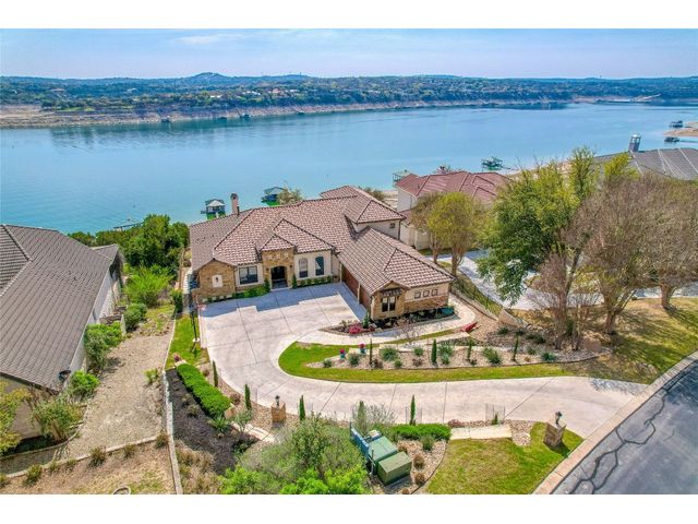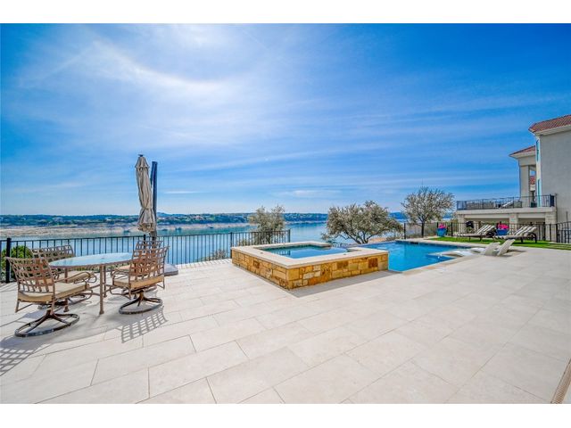 Breathtaking massive Lake Travis views and a beautiful custom Tuscan flavored home built in 2021 is to the market. Located in exclusive Waterford gated subdivision this home has much to offer. Featuring 4 bd and an office downstairs and a game room/bunkroom with full bath upstairs. The kitchen is fully equipped with double ovens, warming oven, 5 burner propane stove, perfect for the gourmet cook. The floorplan is open and free flowing with a wall of sliding doors that open completely to make the patio an extension of the great room. The exterior offers the best of lakeside living with a heated pool and spa, outdoor kitchen with a grill and fireplace. Watercraft storage includes a private boat dock with wave lifts. This property sits on over 11 acres which goes out to approximately the middle of the river bed.