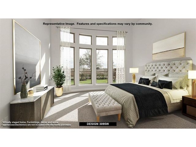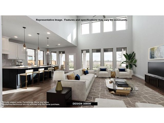 Home office with French doors set at two-story entry. Formal dining room across from staircase. Two-story family room opens to kitchen and morning area. Family room features wall of windows. Kitchen features deep walk-in pantry, Butler's pantry, 5-burner gas cooktop and large island with built-in seating space. First-floor primary suite includes bedroom with wall of windows. Double doors lead to primary bath with dual vanities, garden tub, separate glass-enclosed shower and two walk-in closets. An additional bedroom is downstairs. A game room, media room and secondary bedrooms are upstairs. Extended covered backyard patio. Mud room off four-car garage.