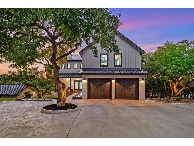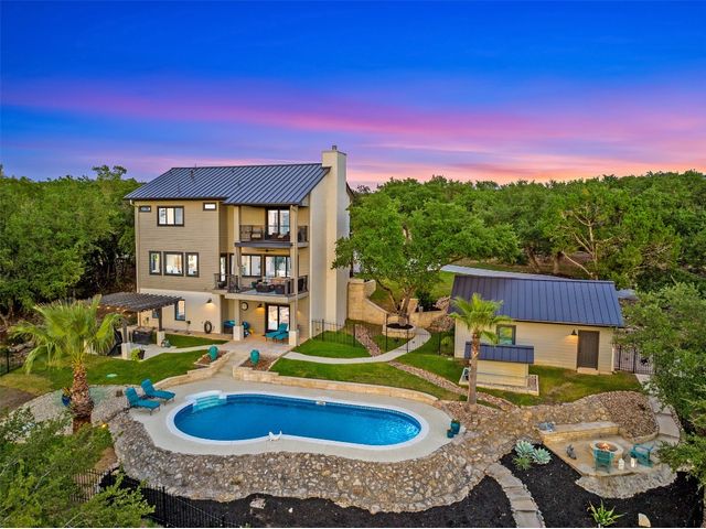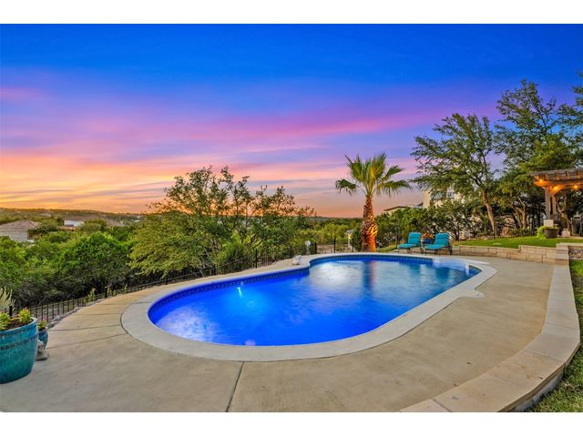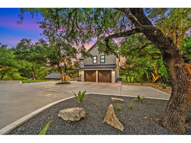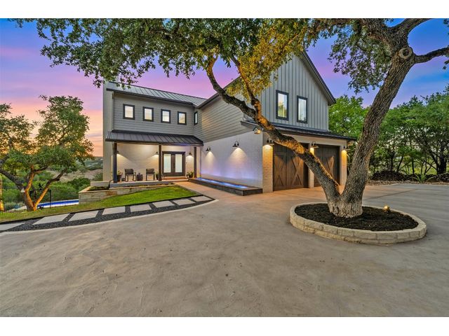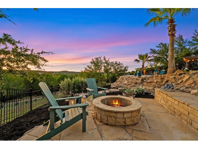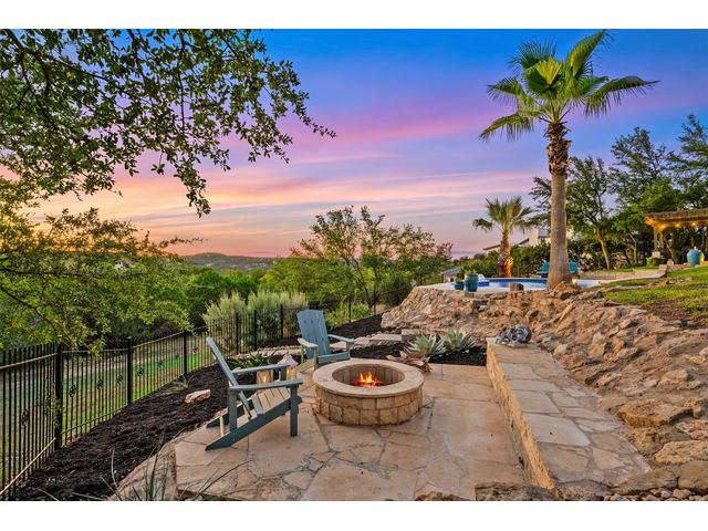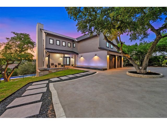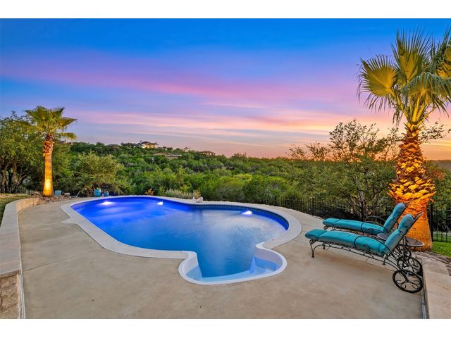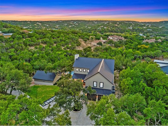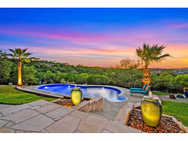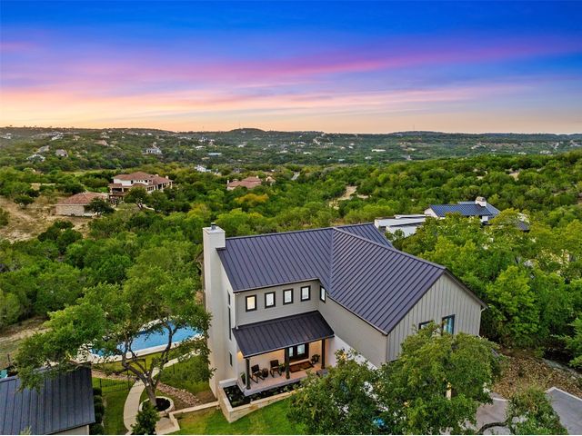 STUNNING PRIVATE ESTATE ~ SPECTACULAR SUNSETS ~ FABULOUS VIEWS ~ IDEAL LOCATION ~ SHORT TERM RENTAL IS ALLOWED! This hill country DREAM HOME is tucked away on 1.5 acres at the end of a quiet cul-de-sac with fabulous curb appeal that provides an idyllic setting of majestic trees with sprawling branches framing the front of the home and a breathtaking backdrop of enchanting rolling hills as far as the eye can see. Exceptional architecture and designer details were carefully considered during the recent renovation including meticulous landscaping with an illuminating light display, a serene water fountain across the walkway to the front door, and an inviting porch that leads you inside to an open living, dining, and kitchen anchored by a wall of windows overlooking jaw dropping views and a backyard paradise. The outdoor oasis includes a resort-like saltwater pool, fountains, palm trees, a pergola for cookouts, and a cozy fire pit for stargazing on cool nights. Warmth and ambiance exudes throughout the main level with a wood burning fireplace. The chef's gourmet kitchen boasts top-of-the-line-appliances, a large center island, and a massive pantry. Relax on the balcony while watching colorful sunsets over the hilltops and an abundance of wildlife. Find serenity while listening to the trickling water from fountains and a creek below. The owner's retreat capitalizes on views from an outdoor seating area as well as windows above an oversized tub and shower in the spa-like en-suite bath. Football games and movies are bigger than life in a theater room equipped with surround sound and a 110' screen. A HEOS system was installed to allow music to be played throughout the home. A 602 SqFt garage with electricity and AC, offers a versatile space for cars, a workshop, a gym, or potential guest quarters. The main house spans 4021 SqFt, providing a peaceful retreat that feels secluded, yet is close to all amenities. Lake Travis ISD. Low tax rate. This is truly a HILL COUNTRY GEM!