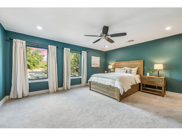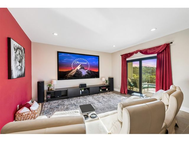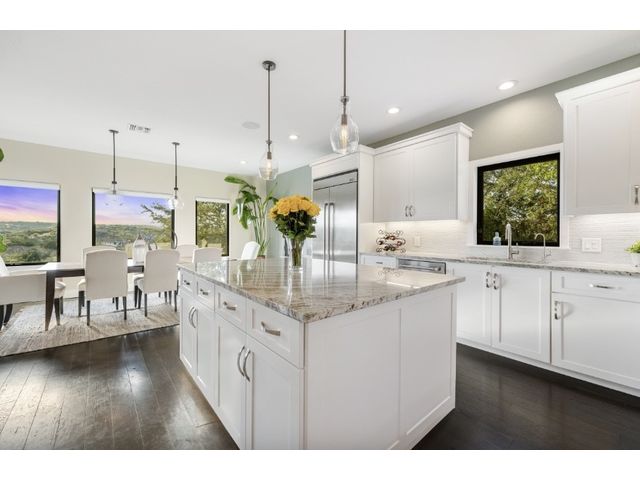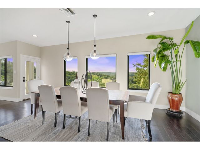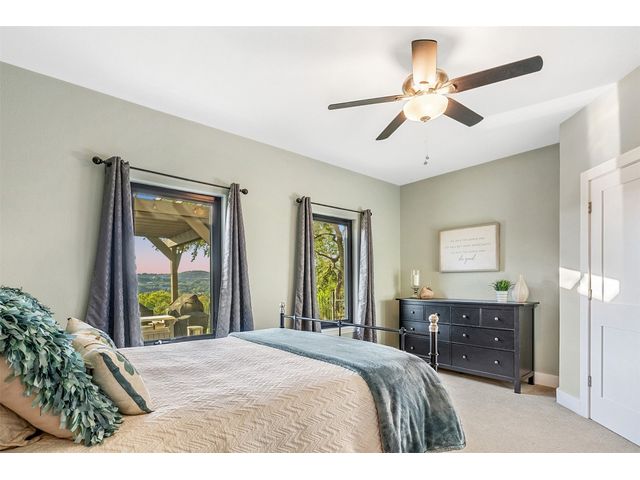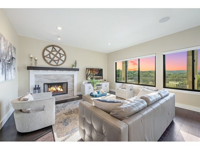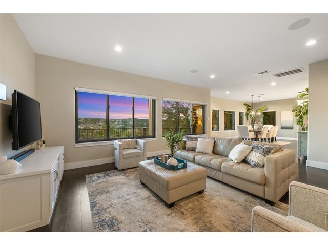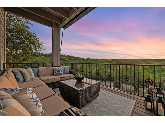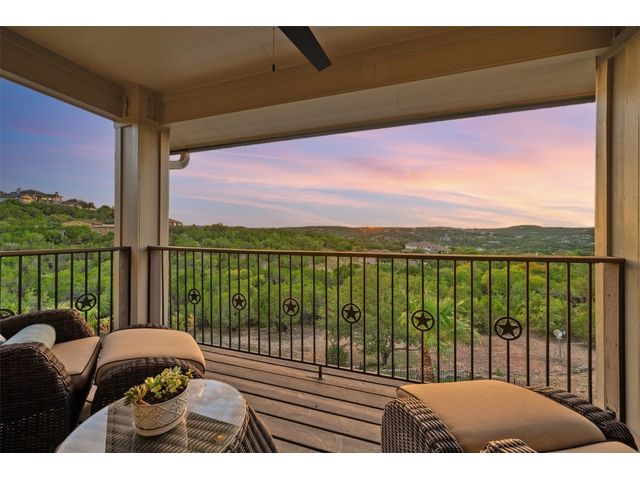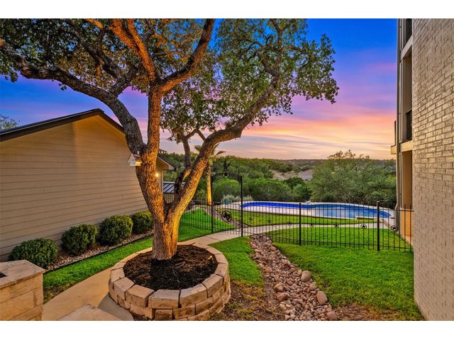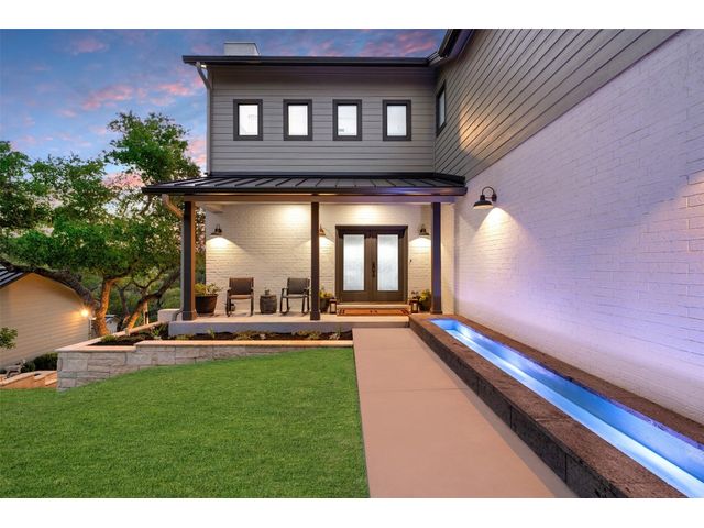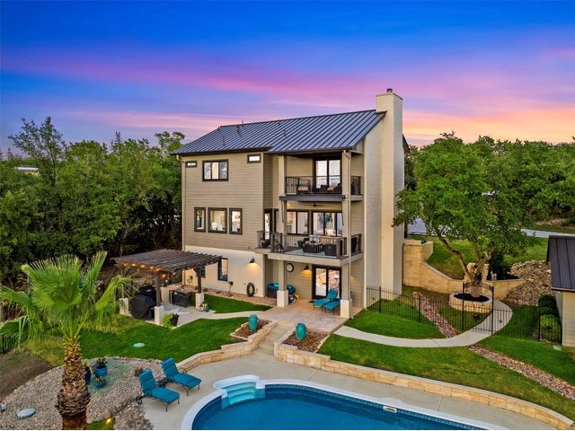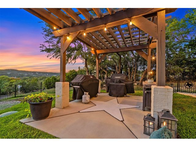 STUNNING PRIVATE ESTATE ~ SPECTACULAR SUNSETS ~ FABULOUS VIEWS ~ IDEAL LOCATION ~ SHORT TERM RENTAL IS ALLOWED! This hill country DREAM HOME is tucked away on 1.5 acres at the end of a quiet cul-de-sac with fabulous curb appeal that provides an idyllic setting of majestic trees with sprawling branches framing the front of the home and a breathtaking backdrop of enchanting rolling hills as far as the eye can see. Exceptional architecture and designer details were carefully considered during the recent renovation including meticulous landscaping with an illuminating light display, a serene water fountain across the walkway to the front door, and an inviting porch that leads you inside to an open living, dining, and kitchen anchored by a wall of windows overlooking jaw dropping views and a backyard paradise. The outdoor oasis includes a resort-like saltwater pool, fountains, palm trees, a pergola for cookouts, and a cozy fire pit for stargazing on cool nights. Warmth and ambiance exudes throughout the main level with a wood burning fireplace. The chef's gourmet kitchen boasts top-of-the-line-appliances, a large center island, and a massive pantry. Relax on the balcony while watching colorful sunsets over the hilltops and an abundance of wildlife. Find serenity while listening to the trickling water from fountains and a creek below. The owner's retreat capitalizes on views from an outdoor seating area as well as windows above an oversized tub and shower in the spa-like en-suite bath. Football games and movies are bigger than life in a theater room equipped with surround sound and a 110' screen. A HEOS system was installed to allow music to be played throughout the home. A 602 SqFt garage with electricity and AC, offers a versatile space for cars, a workshop, a gym, or potential guest quarters. The main house spans 4021 SqFt, providing a peaceful retreat that feels secluded, yet is close to all amenities. Lake Travis ISD. Low tax rate. This is truly a HILL COUNTRY GEM!