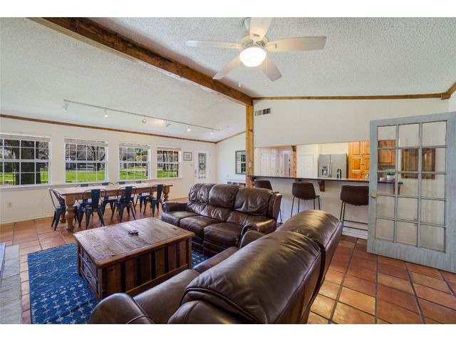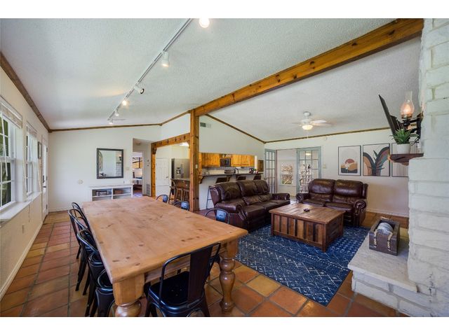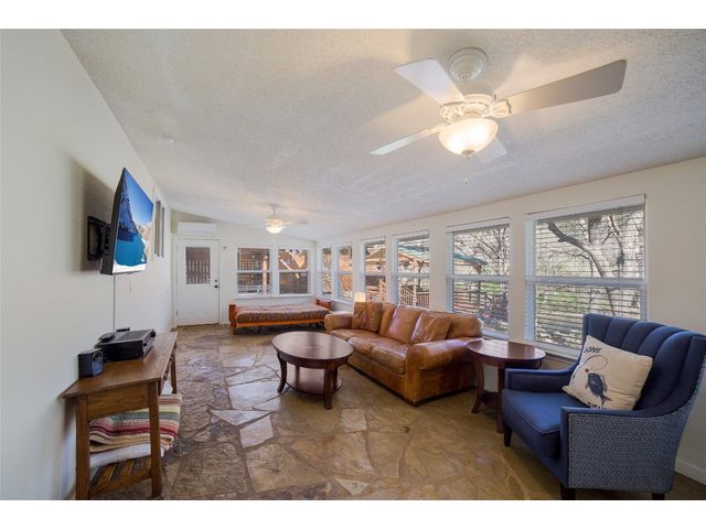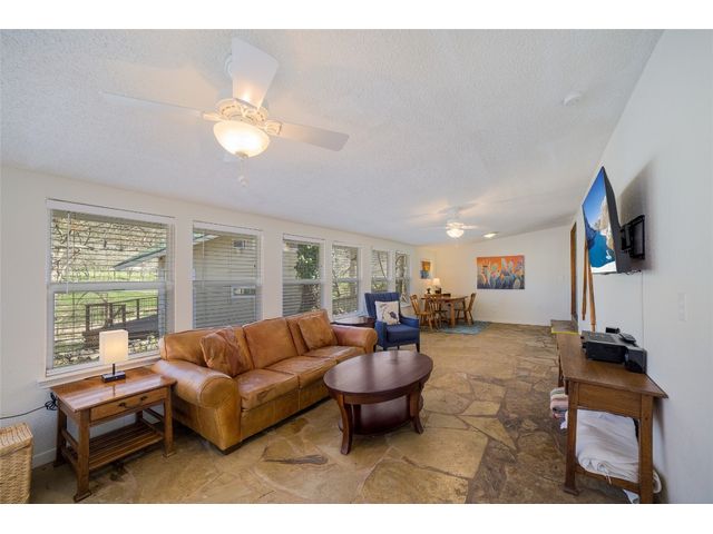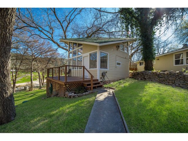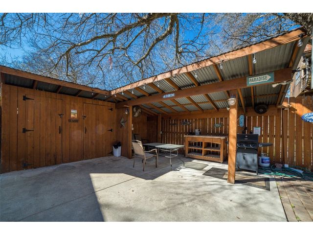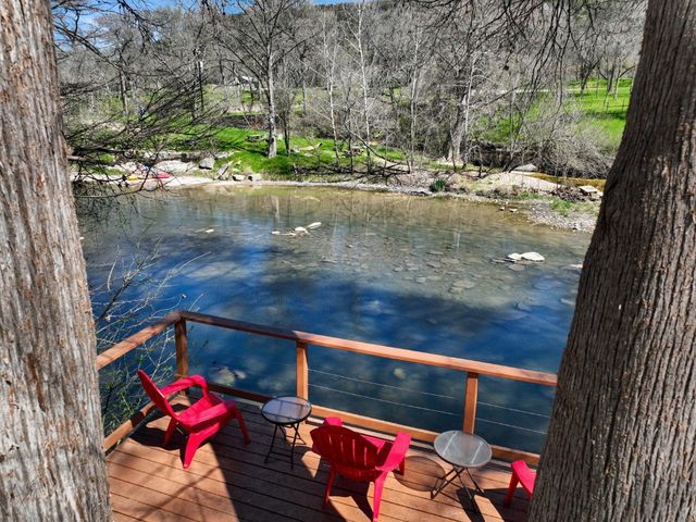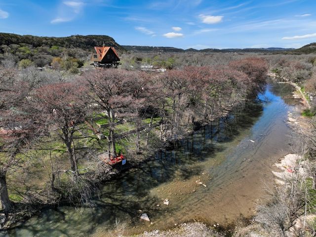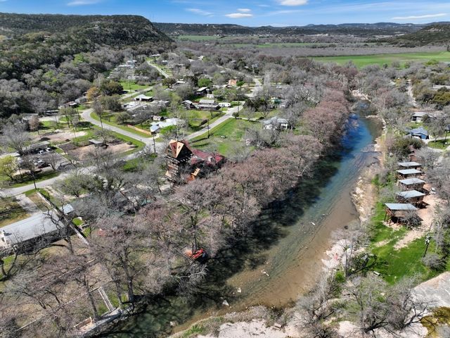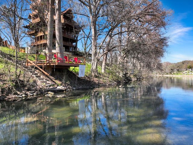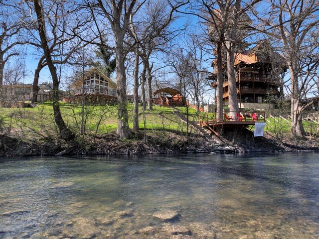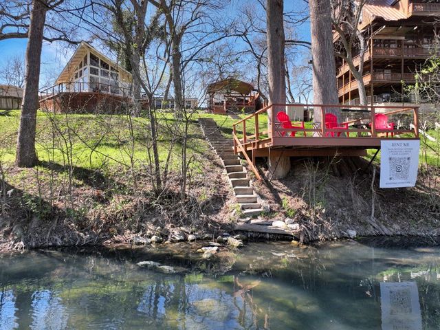 Step into your exclusive riverside sanctuary on the Guadalupe River! Meander down the pathway to the water's edge, where you can wade in or cast your line from the fishing dock. Boasting ample storage for all aquatic gear, indulge in river pursuits to your heart's content. As twilight descends, the outdoor areas illuminate with outdoor lighting surrounding the patio and covered deck. Whether you're hosting a barbecue on the expansive terrace or unwinding with a fine vintage, the river's expansive vistas provide a breathtaking backdrop for every gathering. Indoors, the relaxed sophistication persists with tiled floors and vaulted, beamed ceilings, infusing the living areas with an easygoing allure. The kitchen is a culinary haven, boasting granite countertops, bespoke cabinetry, and stainless steel appliances, facilitating effortless meal preparation. Post-dinner, gather around the crackling flames of the wood-burning fireplace in the living room, where warmth and coziness beckon you to linger a little longer. For those seeking seclusion, the detached guest quarters offer a loft bedroom adorned with vaulted ceilings, a quaint kitchenette, and a lounge area with sweeping river panoramas. Whether entertaining guests or seeking solace, this enchanting space strikes the perfect harmony. Main House is 2,088 sqft. 3/2 and Guest House is 400 sqft. with a loft bedroom and full bathroom.