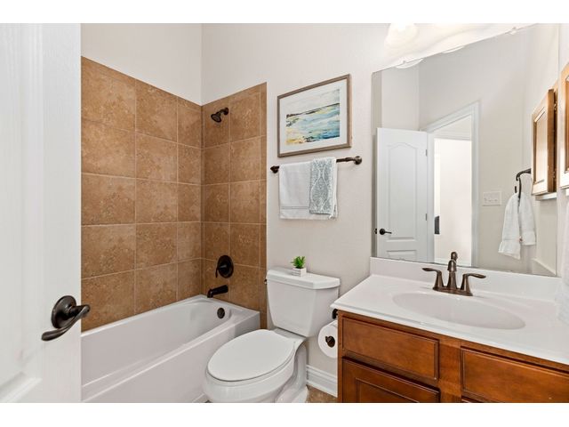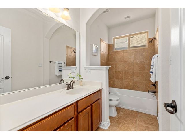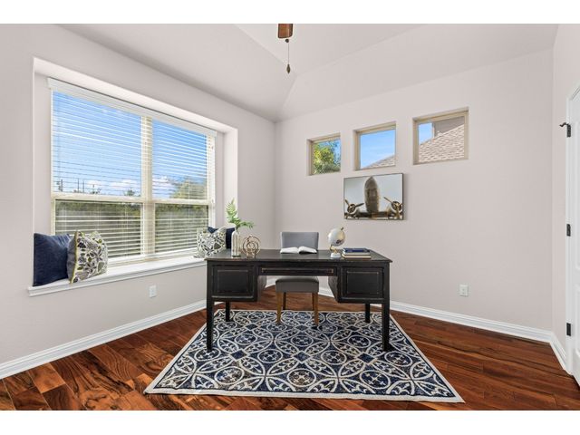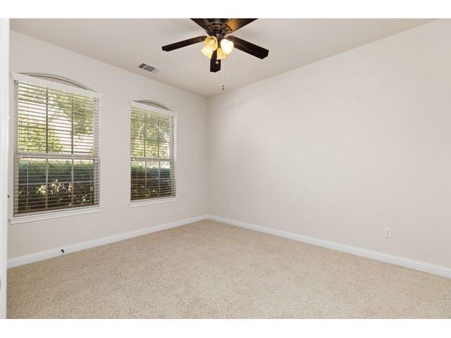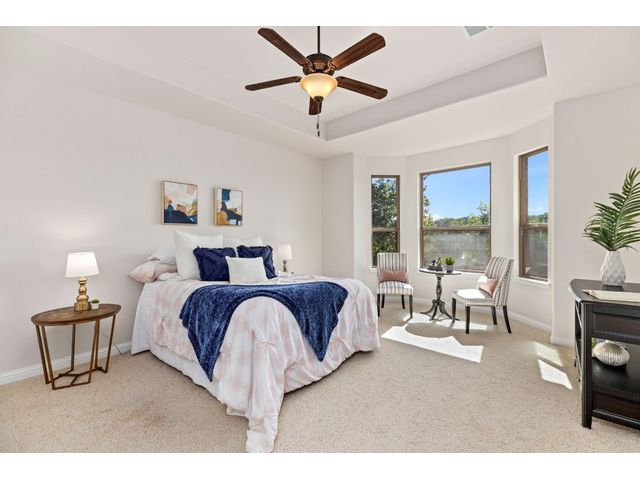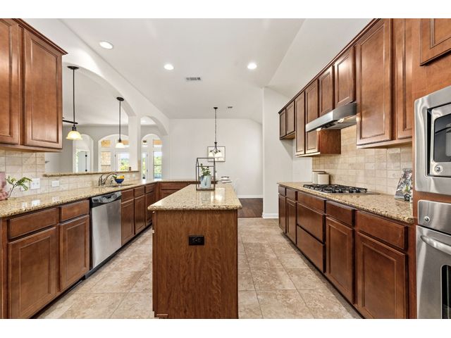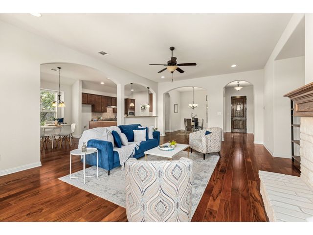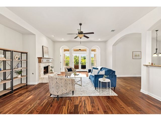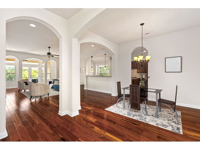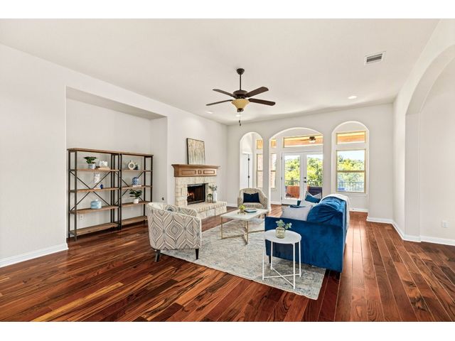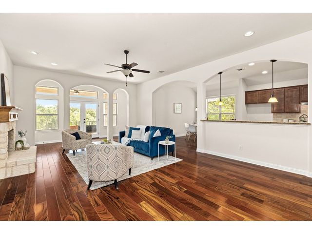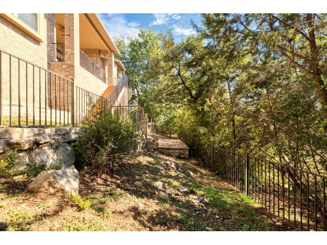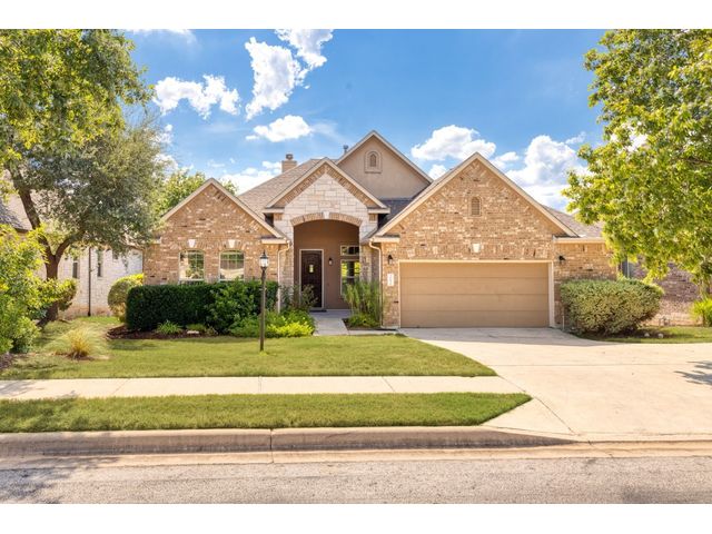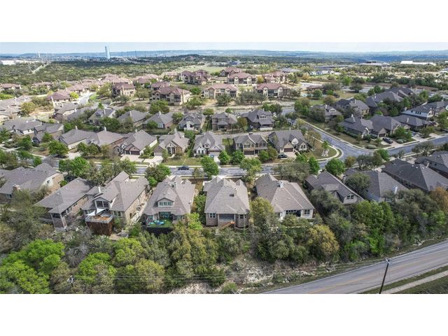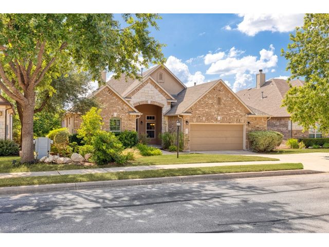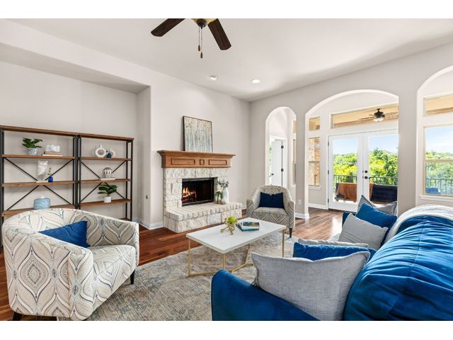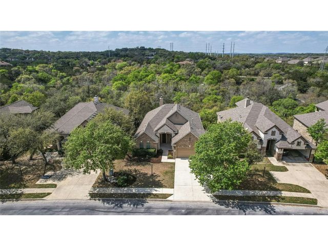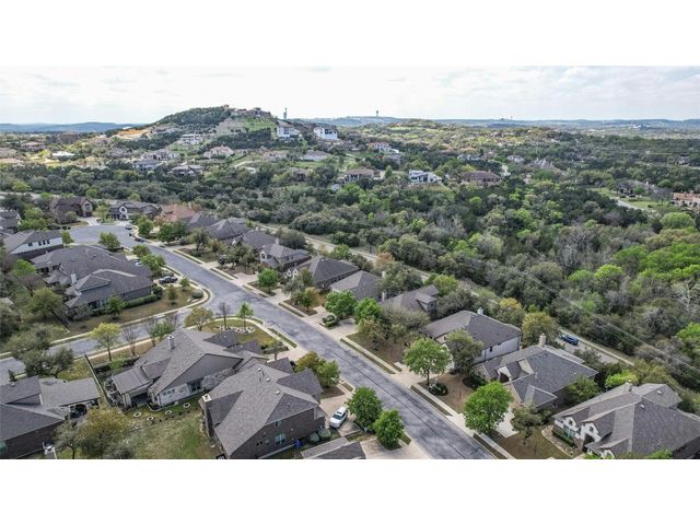 This beautiful, freshly painted one-story home in Lakeway offers four bedrooms and three full baths. As you enter through the covered front porch, you'll be welcomed by a warm and inviting atmosphere with lovely arches leading your view to the stunning Hill Country scenery visible from the private backyard. The primary bedroom is a peaceful retreat with a coffered ceiling, recessed lighting, and a ceiling fan. Its bathroom features double vanities, a garden tub, a separate shower, and a spacious walk-in closet with built-in shelves. Two bedrooms are positioned on opposite sides of the home, with a full bath conveniently between them. The fourth bedroom, which could also serve as an office, boasts hardwood floors and a lovely view, along with its own full bath. The gourmet kitchen is a highlight, featuring built-in appliances and elegant granite countertops. Enjoy outdoor relaxation and entertainment on the private back porch, surrounded by the beauty of the Hill Country. Located in the desirable Lakeway area, this move-in-ready home is waiting for you!