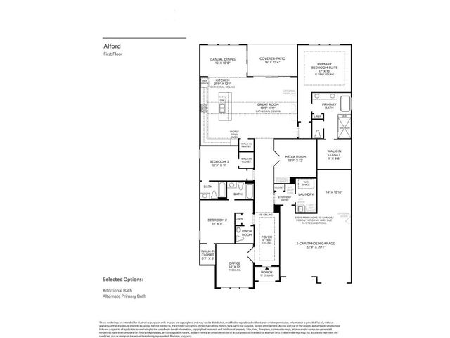 MLS# 6532260 - Built by Toll Brothers, Inc. - October completion! ~ The Alford Transitional plan is a spacious single-story home that features an elongated foyer enhanced with a tray ceiling. A convenient home office with double-door entry is perfect for managing business and schedules. A spacious bedroom with full bath and walk-in closet provides space for guests. A second bedroom with full bath and walk-in closet ensures privacy and space for all. The centralized media room makes entertaining easy. The open great room boasts a cathedral ceiling that extends to the kitchen providing a cohesive feel. Multi-slide doors open the great room to the covered patio, extending your living space to the outdoors. The well-appointed kitchen includes a center island, tons of cabinet space, casual dining area and walk-in pantry. End the day in the gorgeous primary bedroom decorated with a tray ceiling and full bath with dual-sink vanity, separate tub and shower, linen closet and generous walk-in closet. Located in a resort-style community, this is everything you need all on one floor!