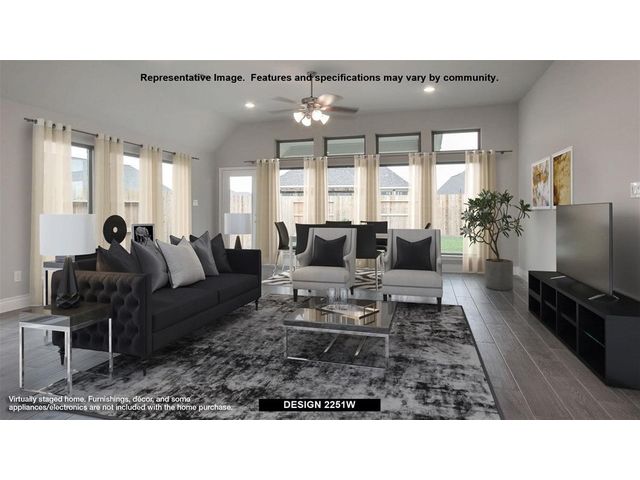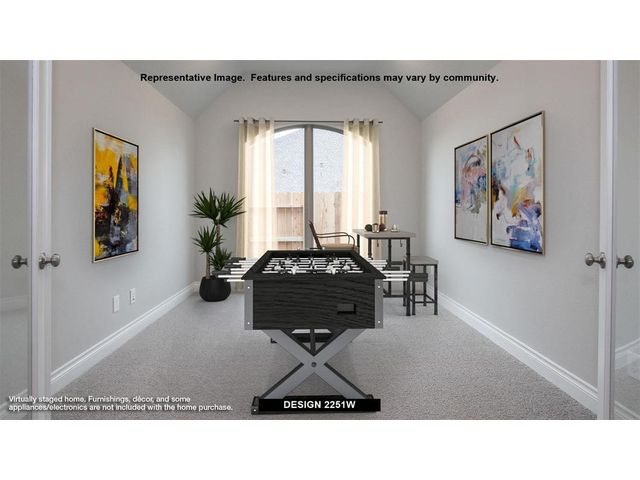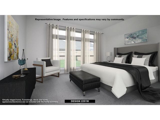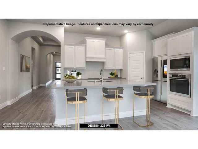 Entry welcomes with 12-foot ceiling. Home office with French doors off extended entry. Open kitchen offers corner walk-in pantry and inviting island with built-in seating space. Dining area flows into open family room with wall of windows. Secluded primary suite includes primary bath with dual vanities, garden tub, separate glass-enclosed shower and two large walk-in closets. Abundant closet space throughout. Extended covered backyard patio. Mud room off three-car garage.