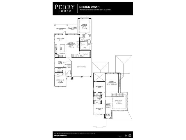 Home office with French doors set at two-story entry. Two-story family room with wall of windows opens to kitchen and dining area. Kitchen hosts inviting island with built-in seating space. First-floor primary suite includes dual vanities, garden tub, separate glass-enclosed shower and large walk-in closet in primary bath. A second bedroom is downstairs. Two secondary bedrooms and a game room are upstairs. Covered backyard patio. Two-car garage.