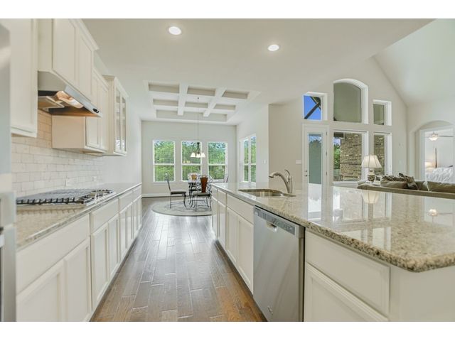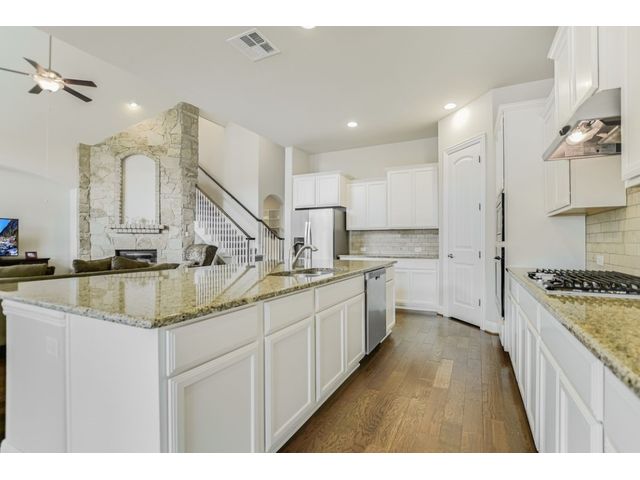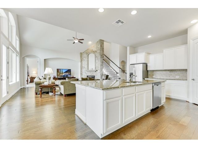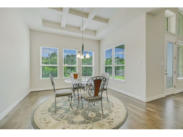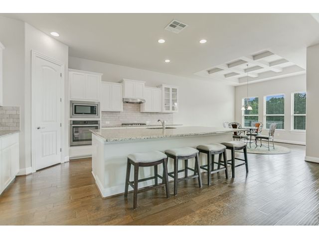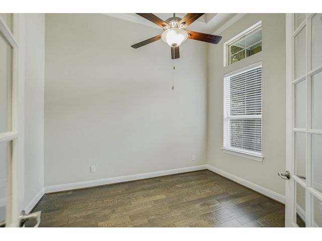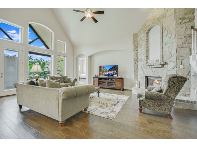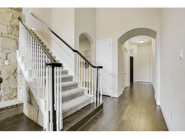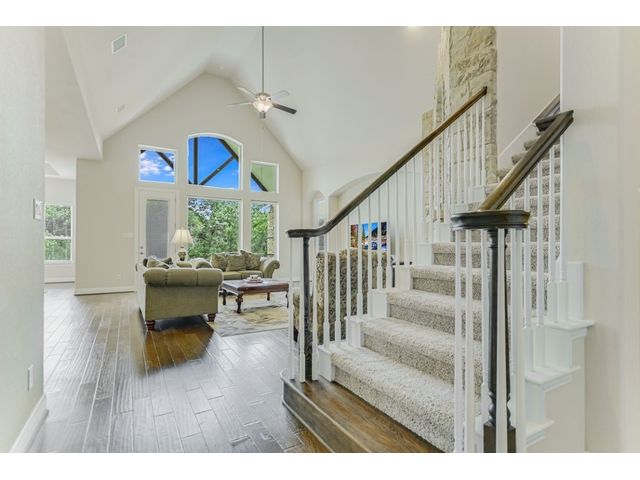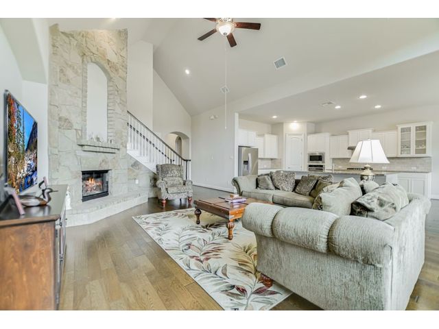 Enjoy the peaceful setting of this beautiful 3 bedroom, 3 full baths and 2 half baths home situated on a premium lot with wrought iron fencing, and backing to neighborhood hike and bike trail and adjoining trees. This "Next Generation" home has a very large primary suite, and a very spacious secondary junior suite, amazing architecture, high ceilings, and a beautiful stone fireplace with raised hearth. There are glass French doors to a dedicated office, a large bonus room upstairs with a 1/2 bath, and large covered back patio and covered entryway. You'll enjoy the close proximity to schools, shopping and parks. This home faces east. From this home it's a short walk to a creek if you like fishing! Seller willing to negotiate separately on washer, dryer, and refrigerator. Standard Flood Hazard Determination Form is in Documents, said no flood insurance was required at this time.