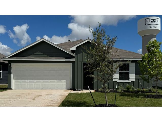 MOVE IN READY! NAVARRO ISD. The Irvine is one of our one-story floorplans offered at Navarro Fields in Seguin, Texas. This 4-bedroom, 2-bathroom home includes a 2-car garage within its 1,796 square feet of comfortable living space. Step into this home from the covered entryway and make your way down the hall to the main living space. The open kitchen looks out to your dining area and family room, allowing for conversations to easily flow from all spaces. The L-shaped kitchen includes granite countertops, a large island with an undermount sink, a corner pantry closet, stainless-steel appliances and 36’’ upper cabinets. Off the family room is the primary bedroom, with its own private bathroom. This relaxing bathroom space features a 5’ walk in shower, vanity, private toilet area with a door, and an oversized walk-in closet. At the front of the house, you will find bedroom 2 and 3, with the secondary bathroom conveniently located between the rooms. Bathroom 2 includes a tub/shower combination and open shelving for extra storage or décor. Across the foyer and down a short hall is the utility room and bedroom 4. Whether you use these rooms as an office, child’s room or guest room, there is enough space for work, sleep, and play. The Irvine includes vinyl flooring throughout the common areas of the home, and carpet in the bedrooms. All our new homes feature a covered back patio, full sod, an irrigation system in the front and back yard, and a 6’ privacy fence around the back yard. This home includes our America’s Smart Home base package, which includes the Amazon Echo Pop, Front Doorbell, Front Door Deadbolt Lock, Home Hub, Thermostat, and Deako® Smart Switches.